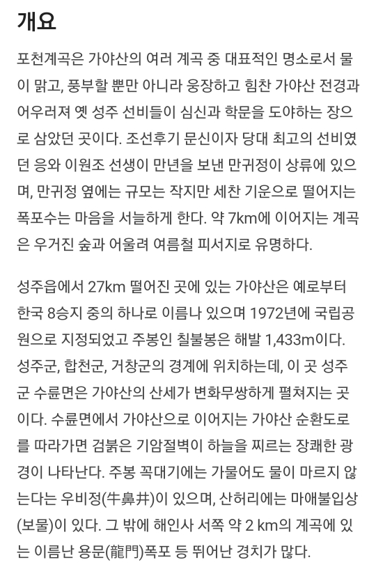 포천계곡은 경북의 명산 가야산의 맑은 물을 즐길 수 있는 아주 멋진 계곡입니다