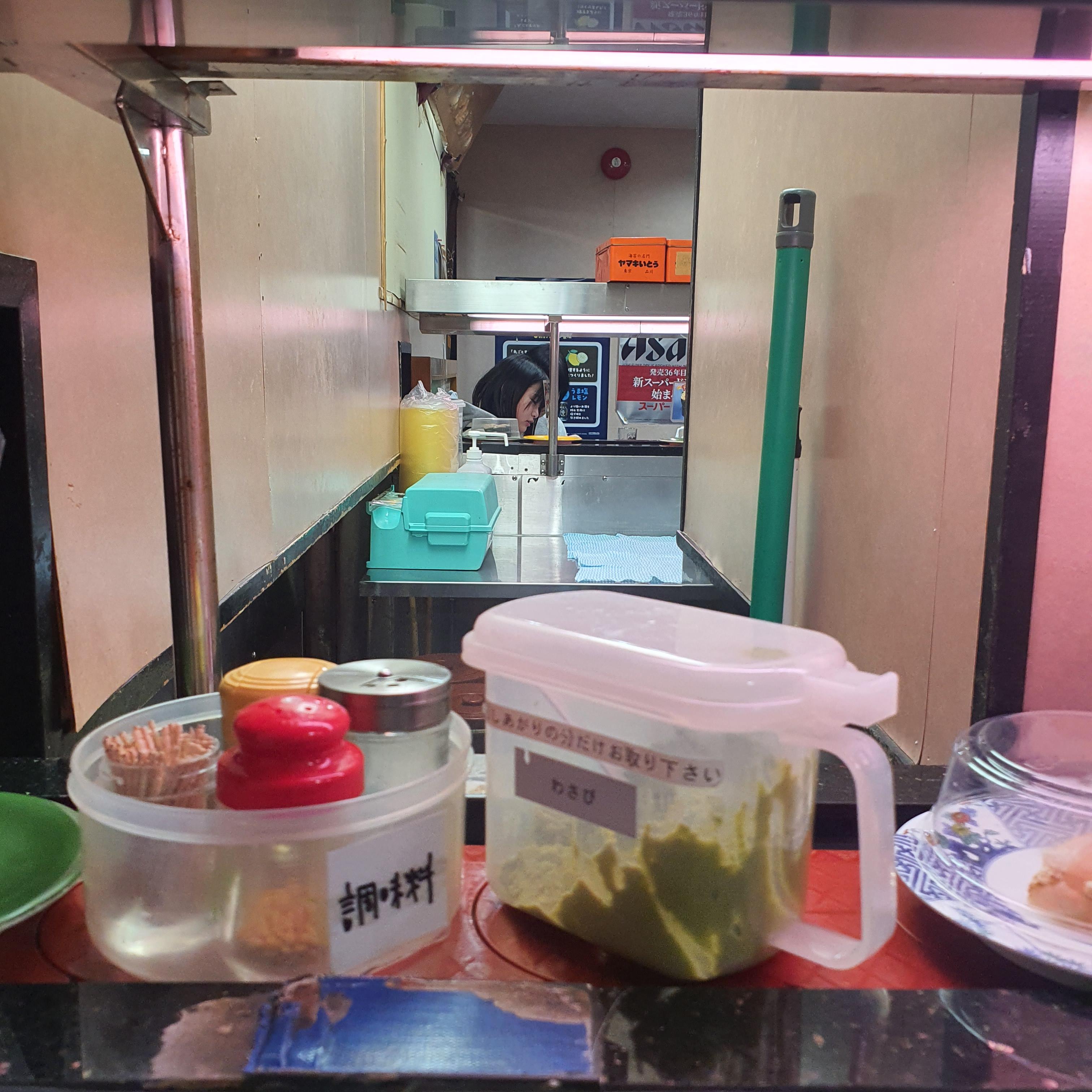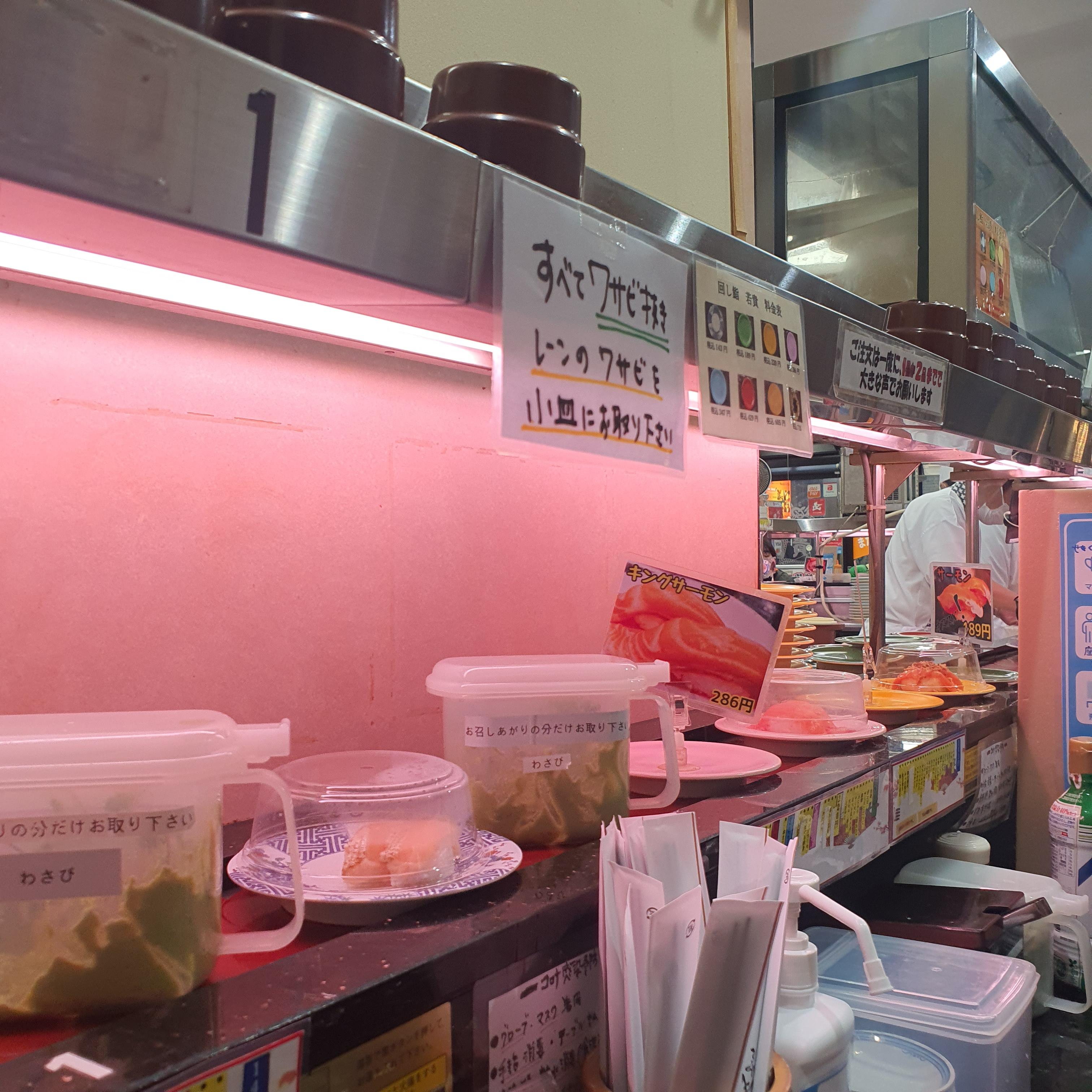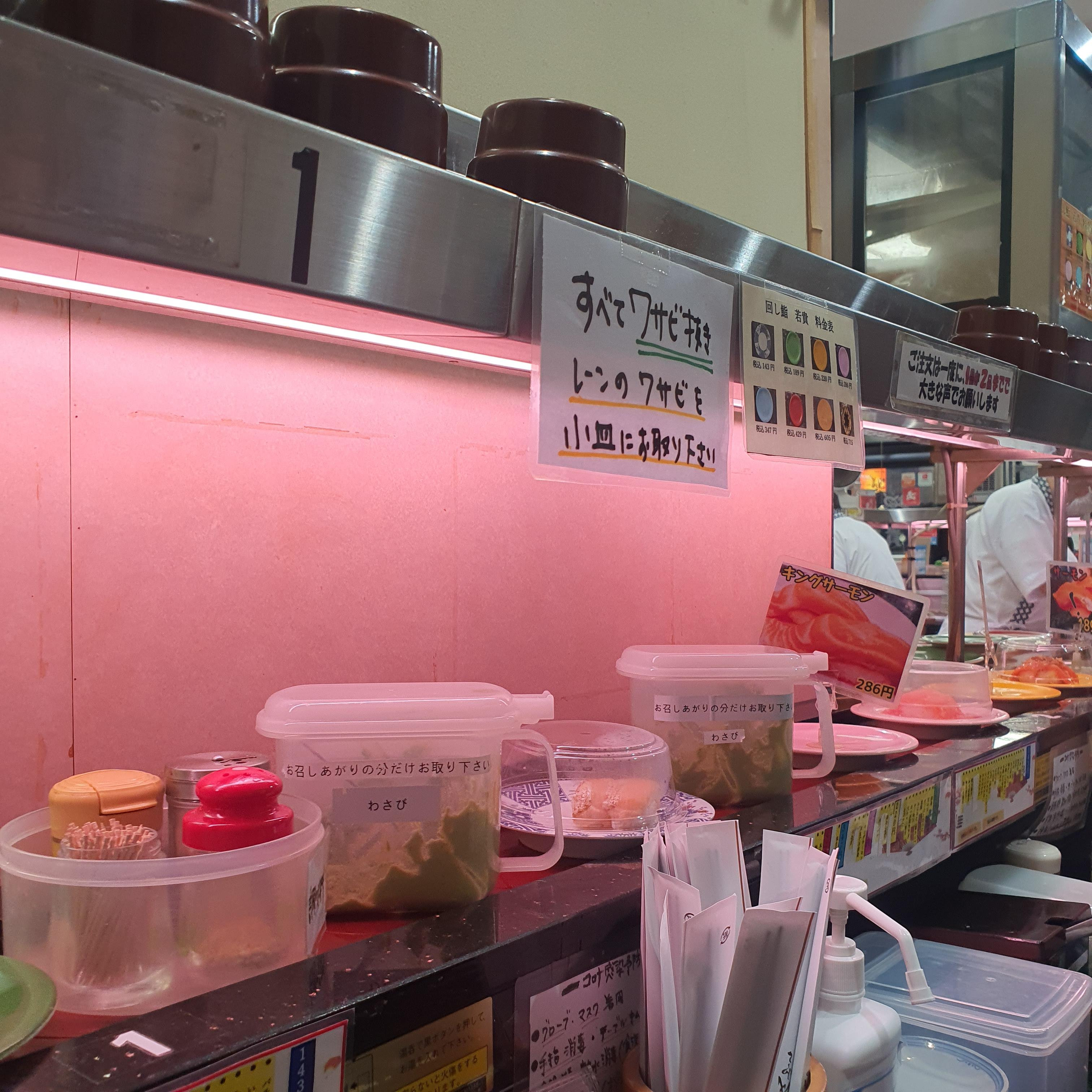 컨베이어 벨트 위로 여러 초밥이 오가고, 와사비나 양념도 자리에 가져와 필요한 만큼 덜고 다시 올려두면 되고, 그릇별로 가격이 다릅니다