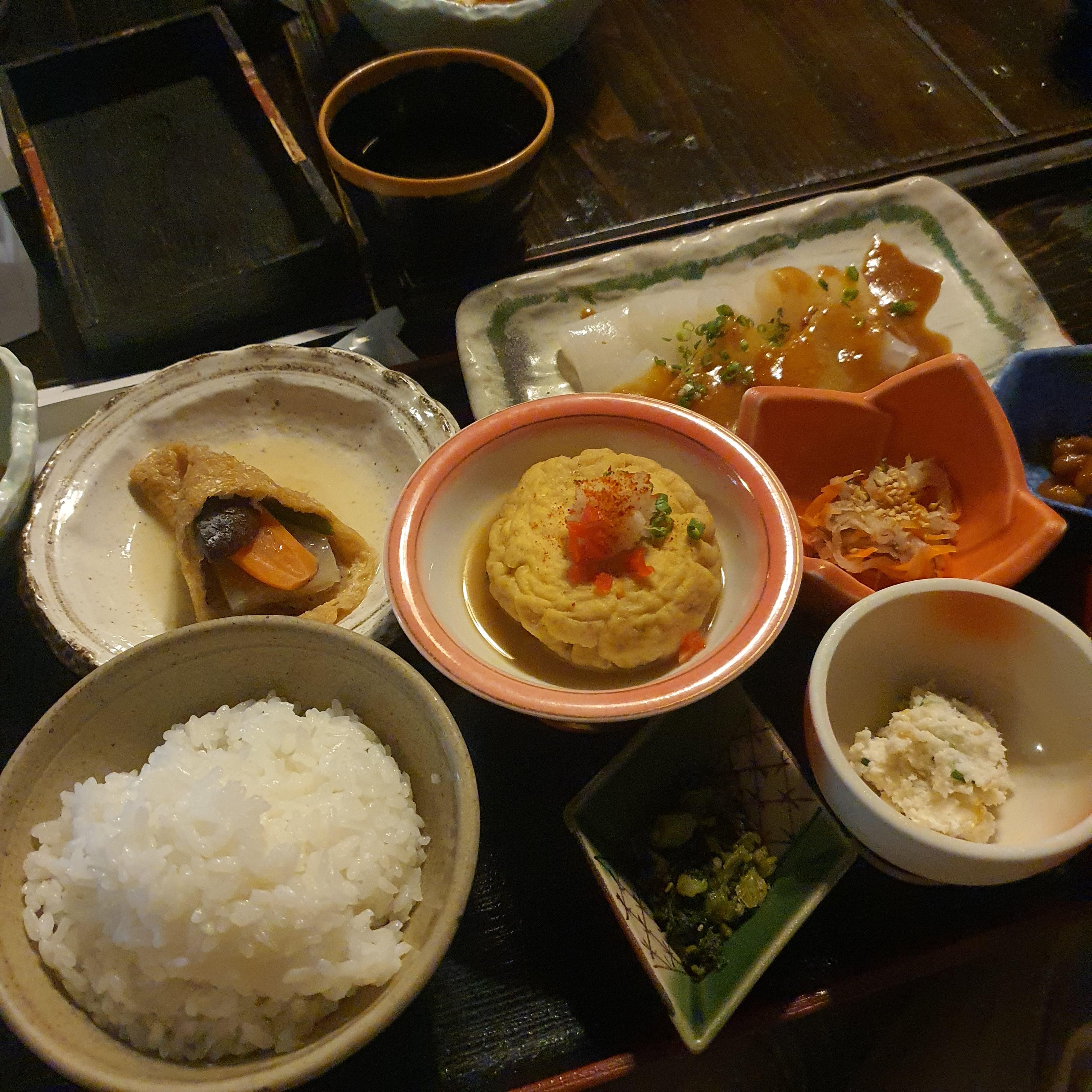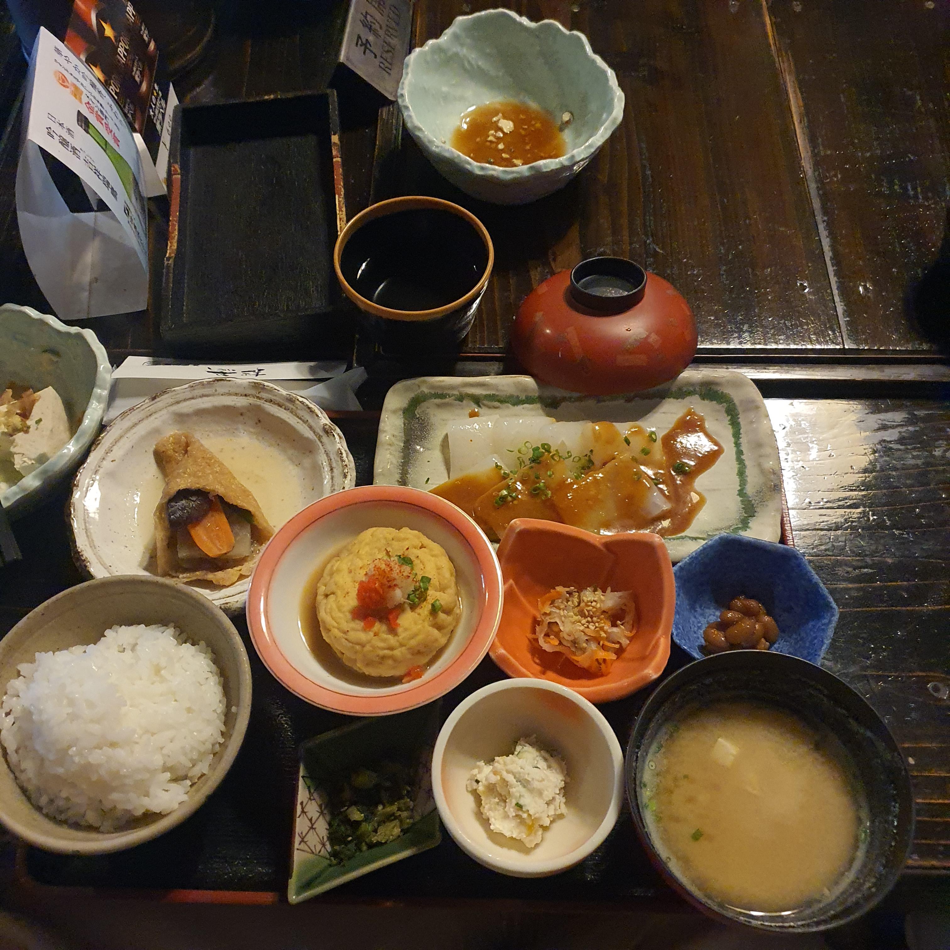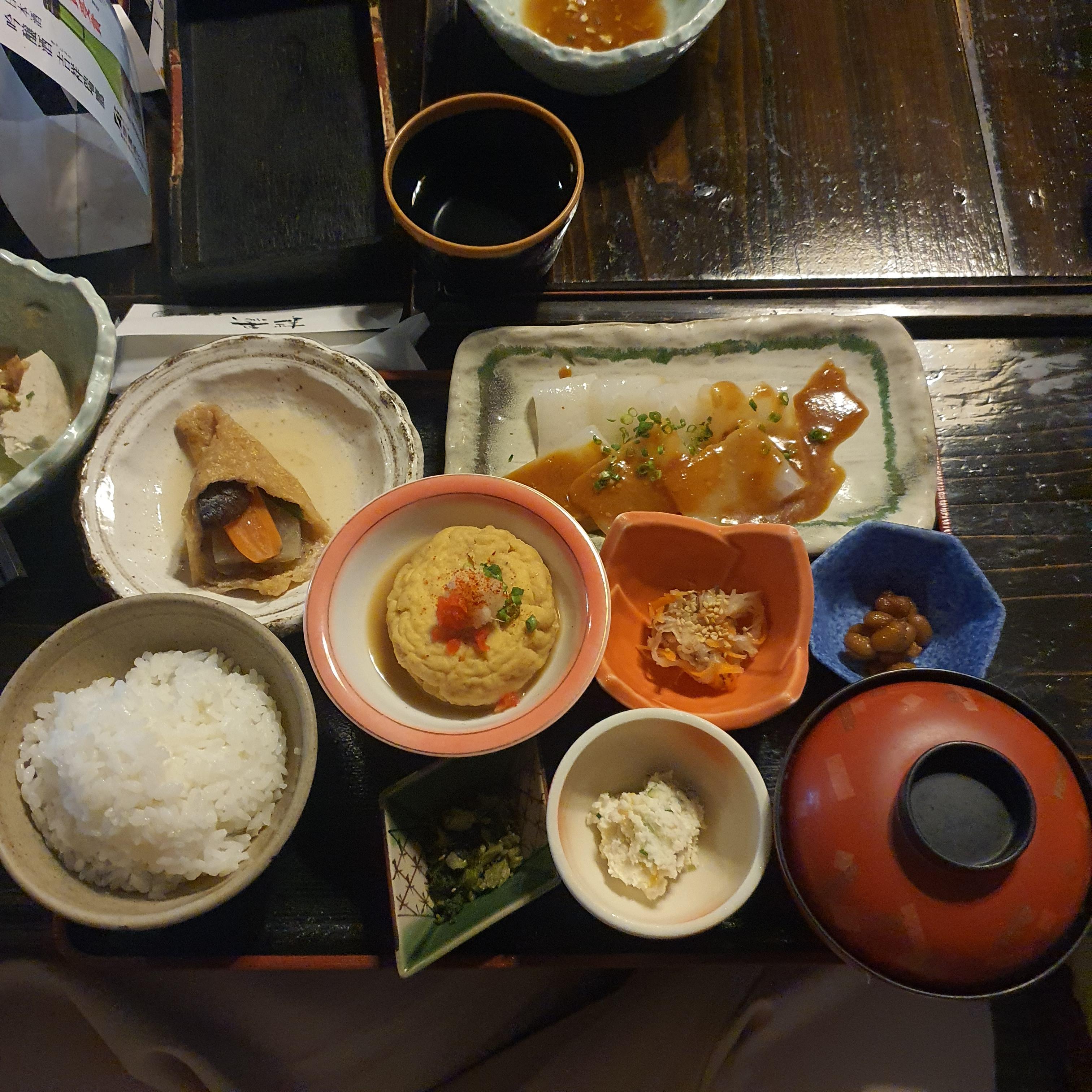 일본 구마모토 쿠로가와 온천마을 두부맛집, 정갈 담백 푸짐한 일본 두부정식 한상, 곤약과 유부 맛도 최고, 아소산 여행