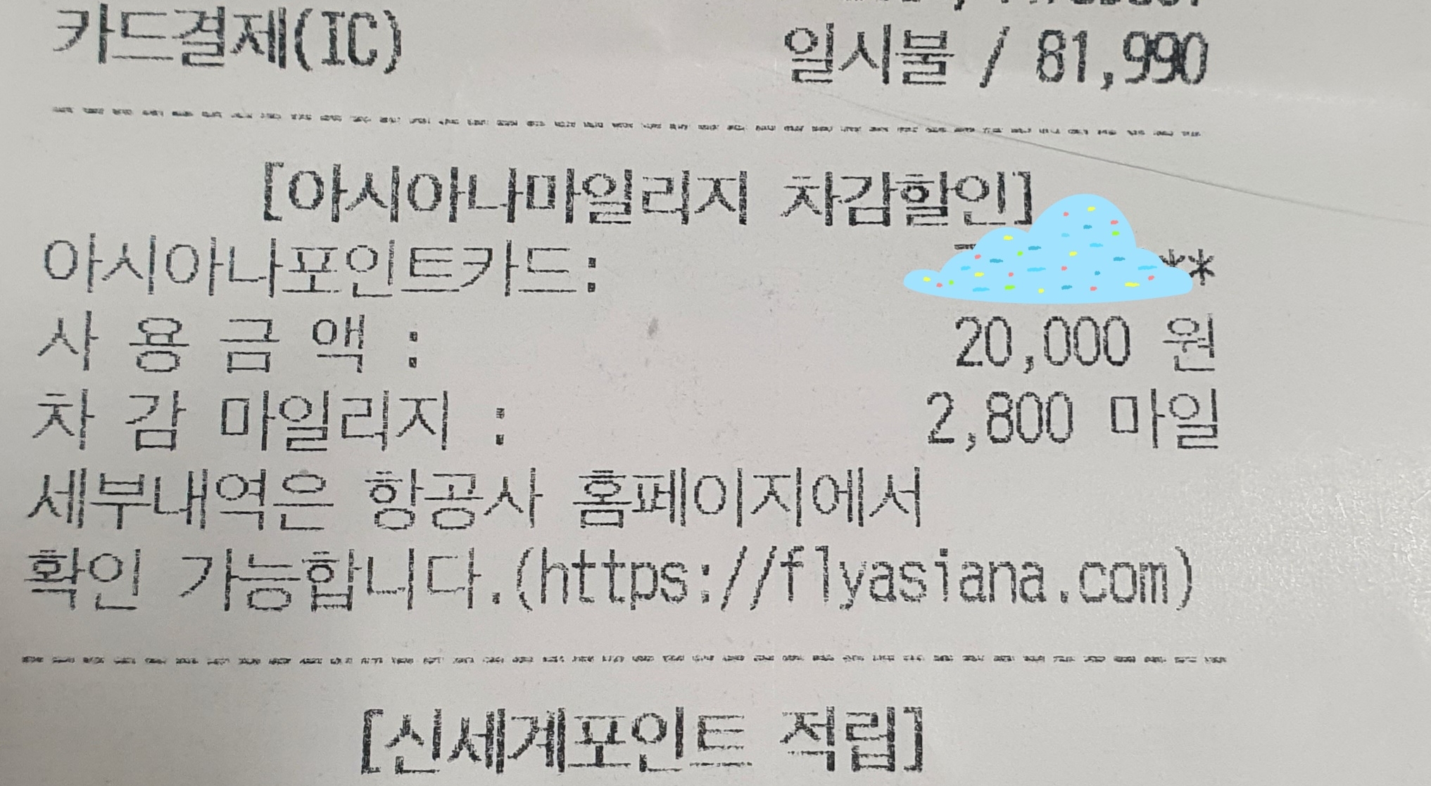 아시아나 마일리지 2800점을 차감하고 2만원을 할인받았습니다