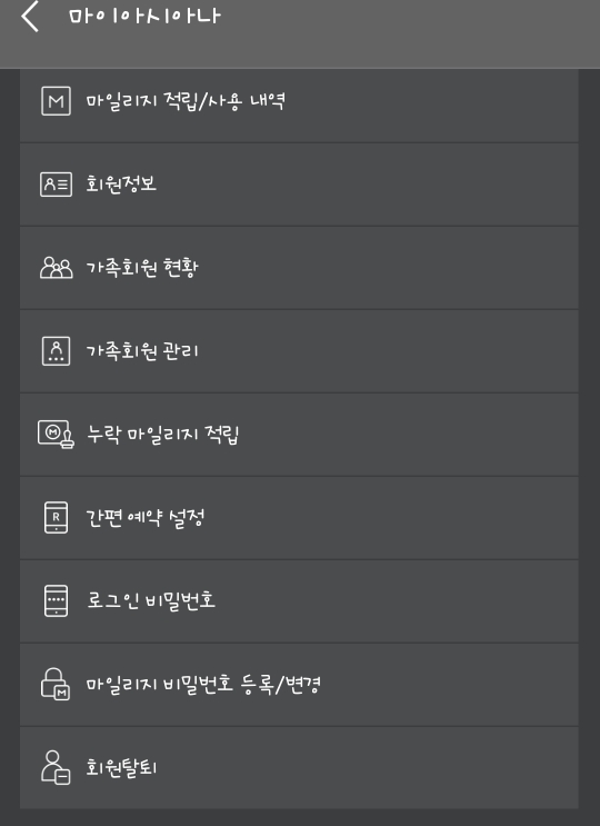 메뉴 중 '마이아시아나' 탭을 열어줍니다