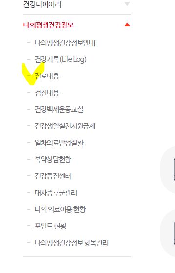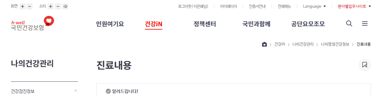 이를 클릭하면 최근 몇 년 간의 진료내용, 검진내용 모두 확인이 가능합니다