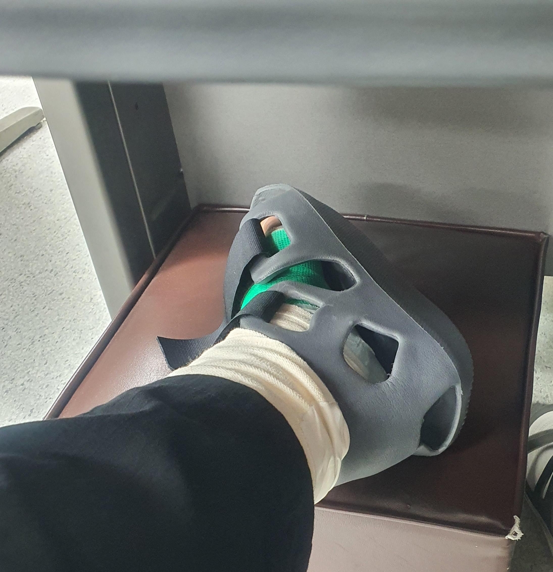 발목 뒷부분이 펴지지 않도록, 발이 세로로 서는 모양으로 깁스 고정이 되어 있습니다