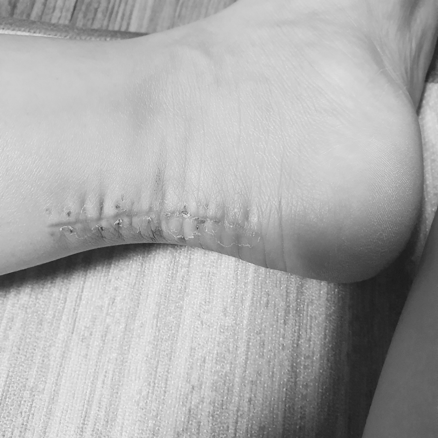아킬레스건 수술 후 실밥을 푼 모습입니다