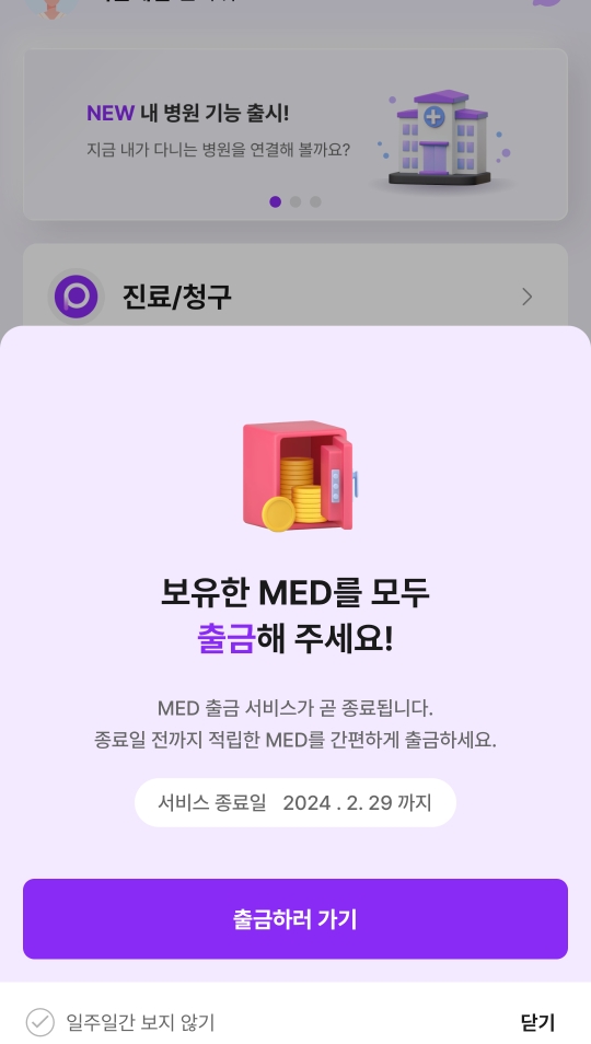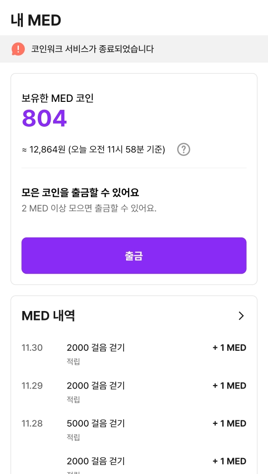 그동안 알뜰살뜰 만보기 등으로 모은 MED 코인을 출금할 시간입니다