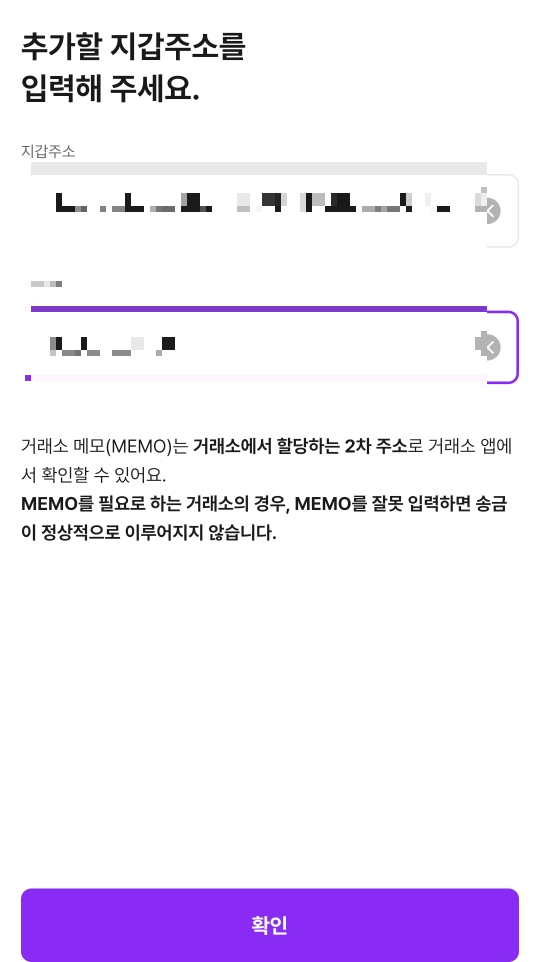 아까 빗썸 앱에서 복사한 지갑 정보를 그대로!! 입력해야 한다는군요
