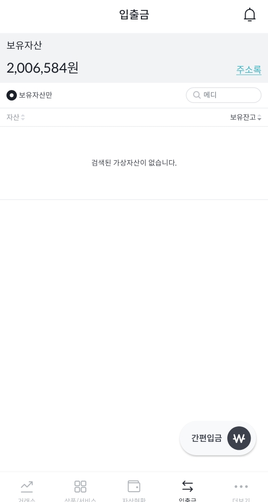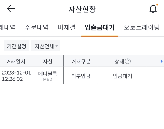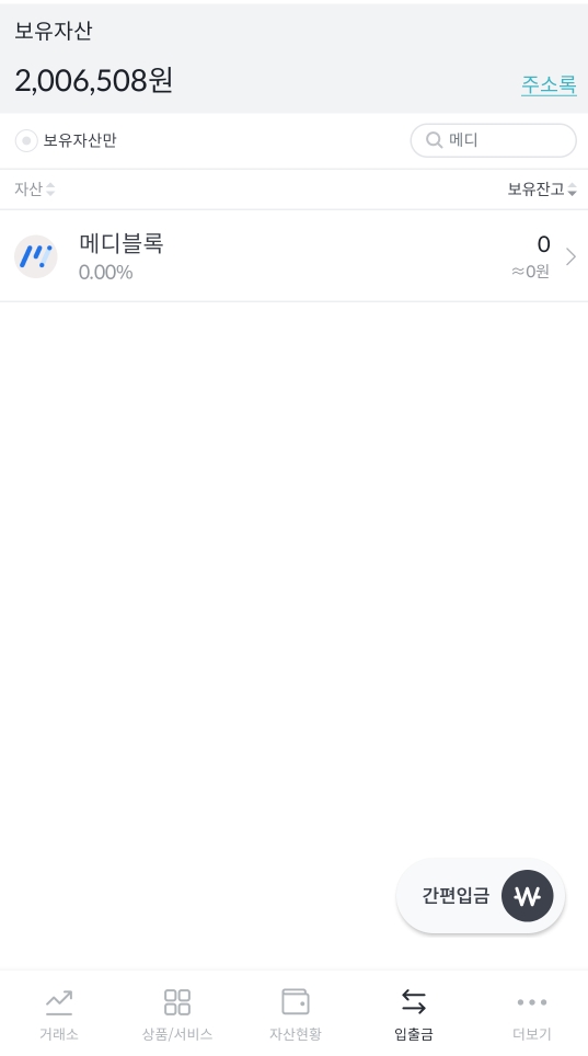 잔고에서는 바로 확인이 안 되고, 입출금 대기에 메디블록이 무사히 들어온 것이 보입니다