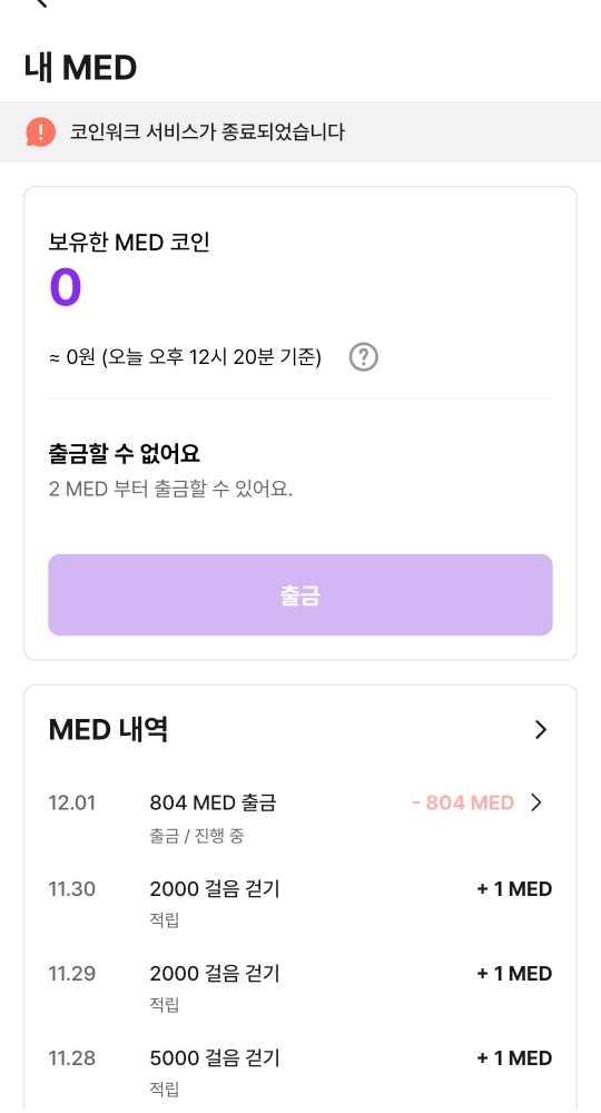 그동안 열심히 모은 MED 코인 잔액이 0이 된 걸 볼 수 있습니다
