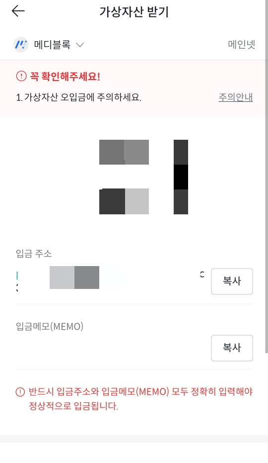 이제 메디블록 MED 코인을 받기 위한 지갑의 입금주소와 입금메모, QR코드까지 생성되었습니다