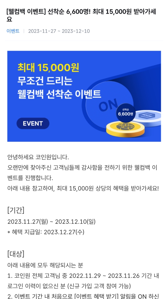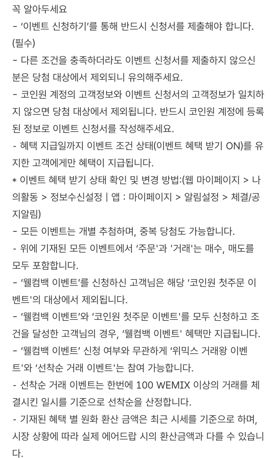 그리고 이번 이벤트는 코인원 웰컴백 이벤트와 중복 응모가 불가능하다고 하는데요