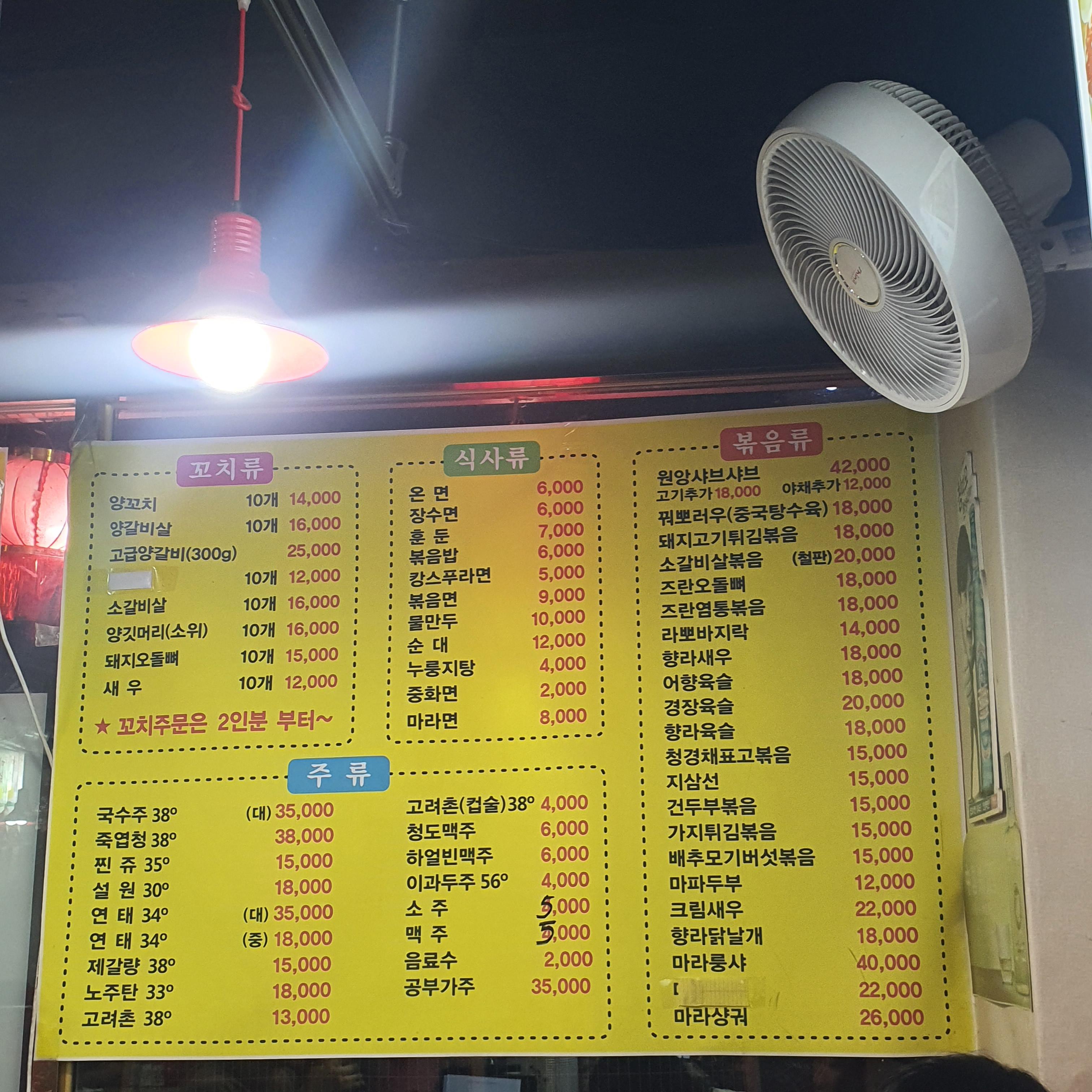 상인동 오성양꼬치 메뉴입니다