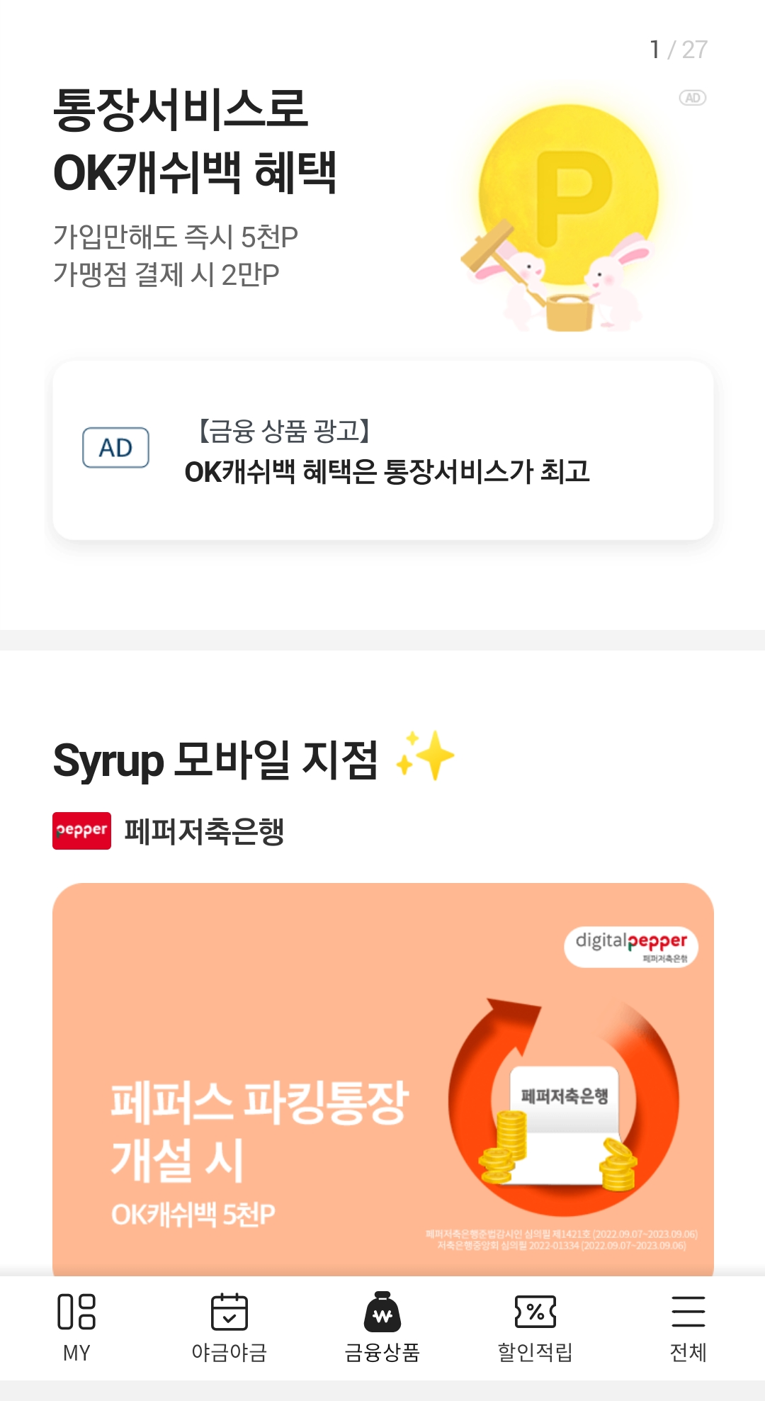 하단에 '금융상품' 탭을 클릭하면 바로 페퍼스 파킹통장 개설 이벤트 배너를 확인할 수 있습니다