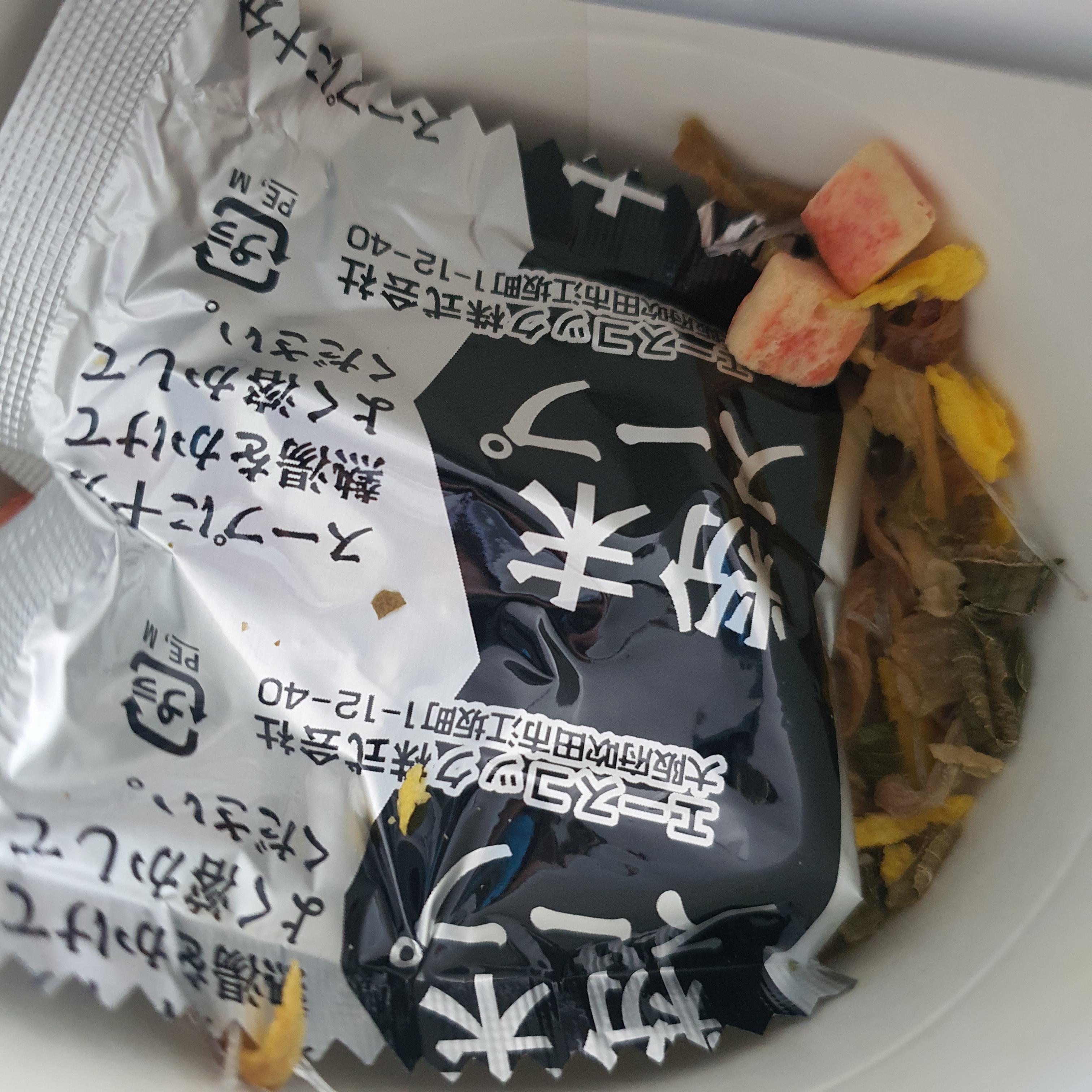 뚜껑을 여니 건더기 스프와 함께 가루스프 봉지가 들어 있습니다
