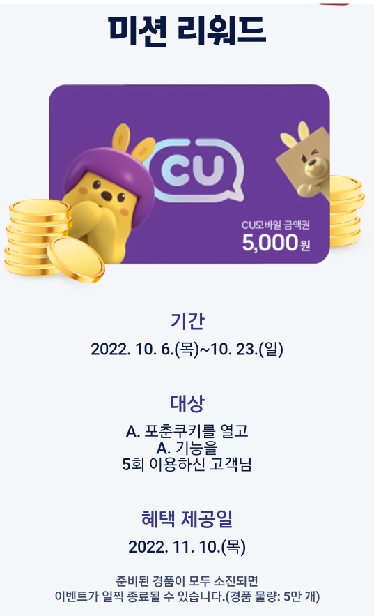 5일 출첵 시 CU편의점 쿠폰 5000원 지급해요