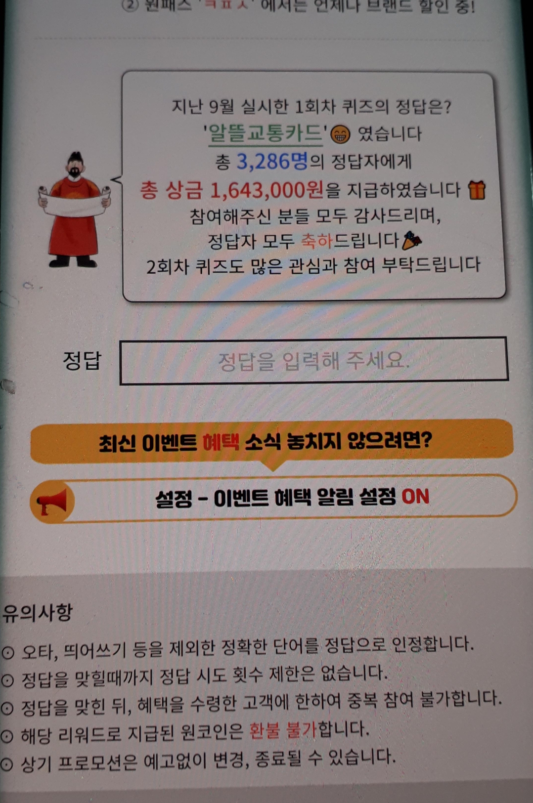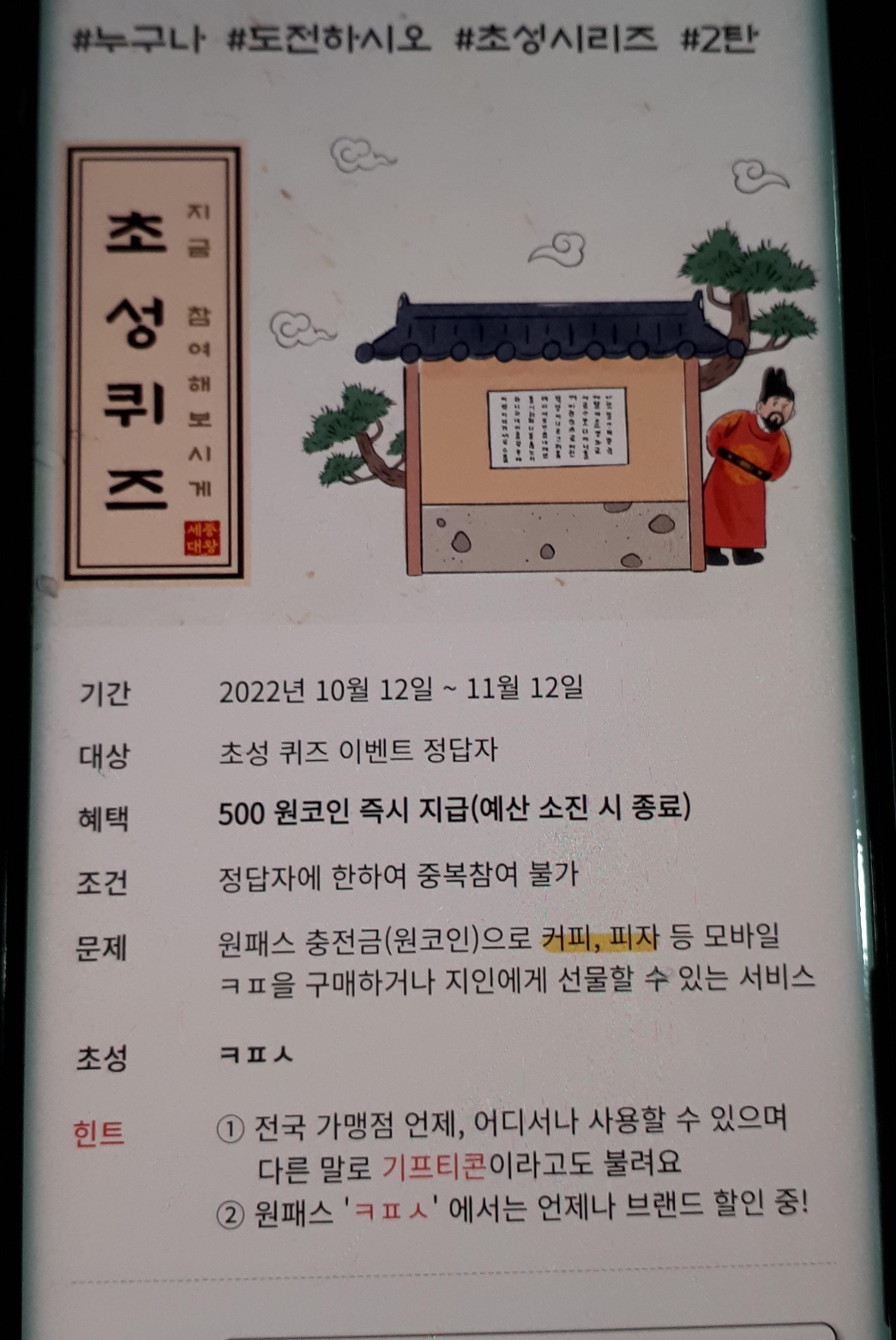 원패스 초성퀴즈 ㅋㅍㅅ 정답