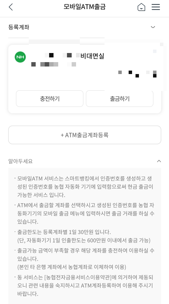 농협 통장이나 카드 없이 현금 인출하기, 폰뱅킹 앱에서 모바일atm 이용, 모바일 atm 이용 방법