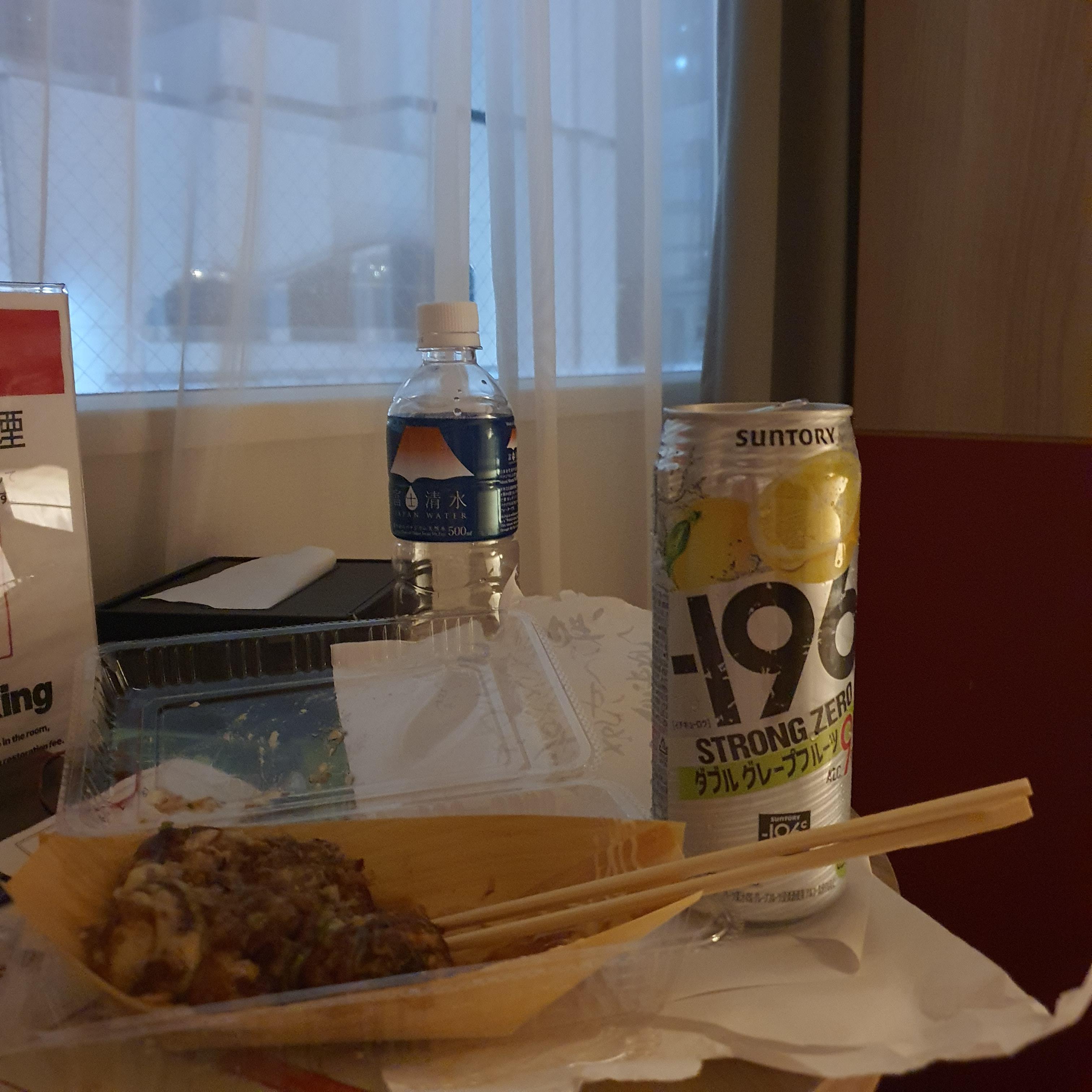타코야끼에 스트롱제로 맥주를 한잔 하면서 여행지에서의 마지막 밤을 즐겨봤습니다