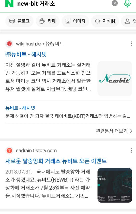 네이버에 new-bit 거래소를 검색했을 때도 최근 블로그 게시물에 이 문자가 스미싱이라는 글이 먼저 나오고요