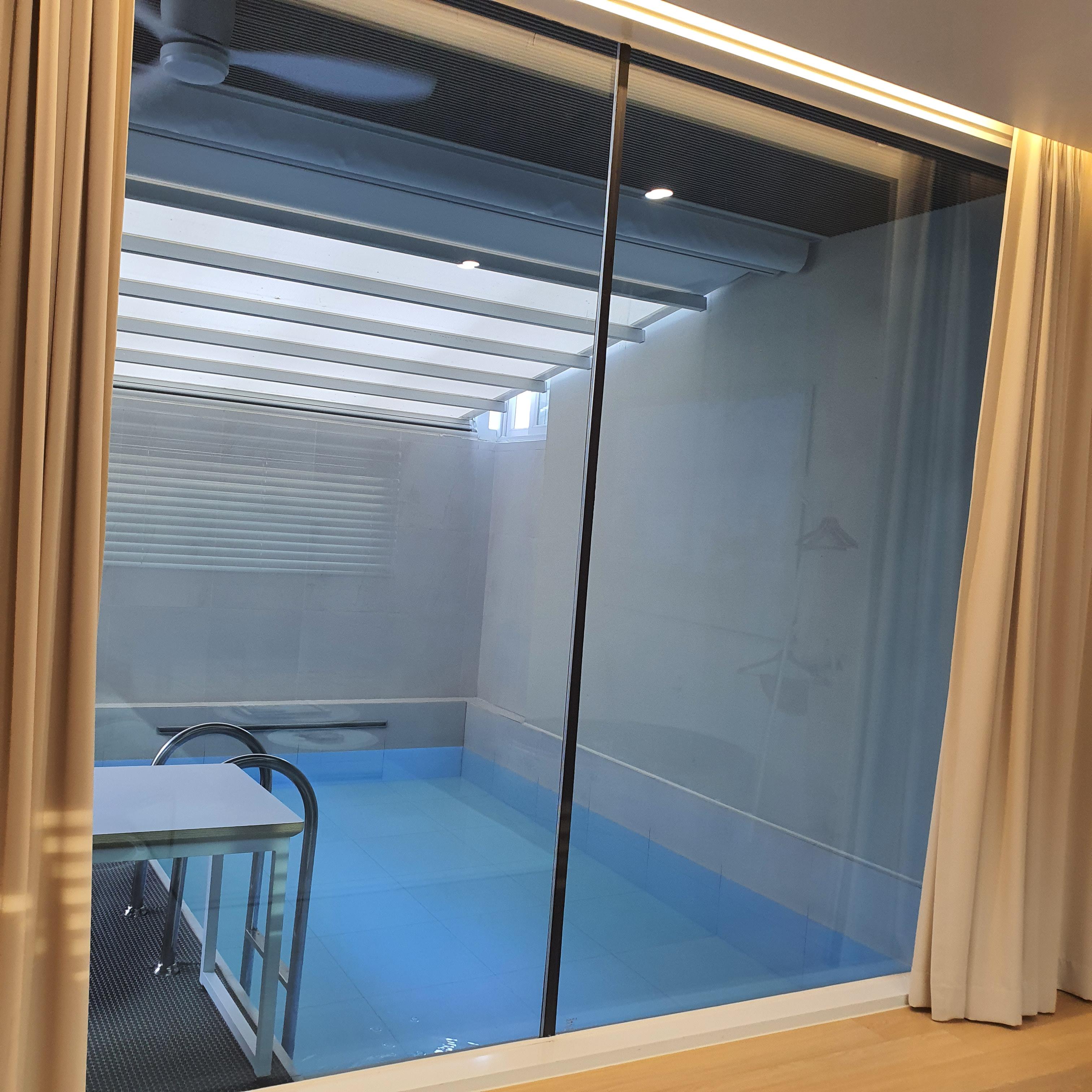 수영장이 통창으로 보이기 때문에 아이들이 놀 때도 안전하게 지켜볼 수 있고 보기에도 예쁩니다