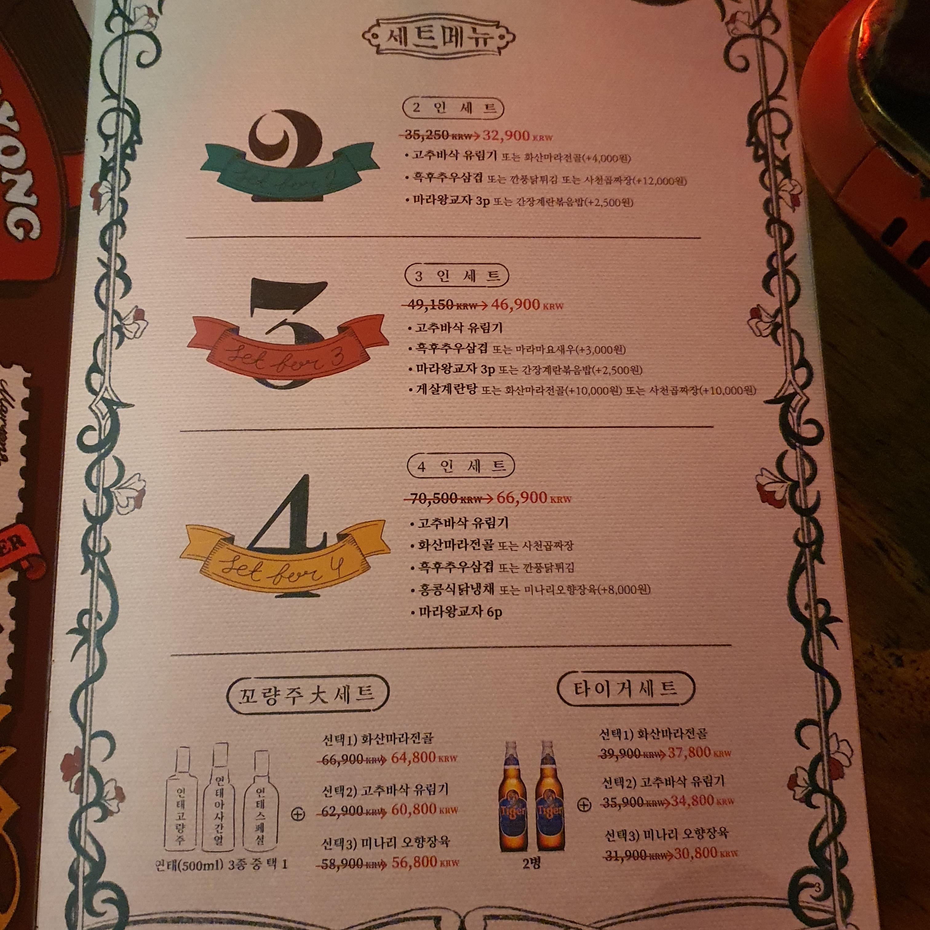 저는 친구와 둘이 가서 화산마라전골과 고추바삭유린기(유림기)를 시켰습니다
