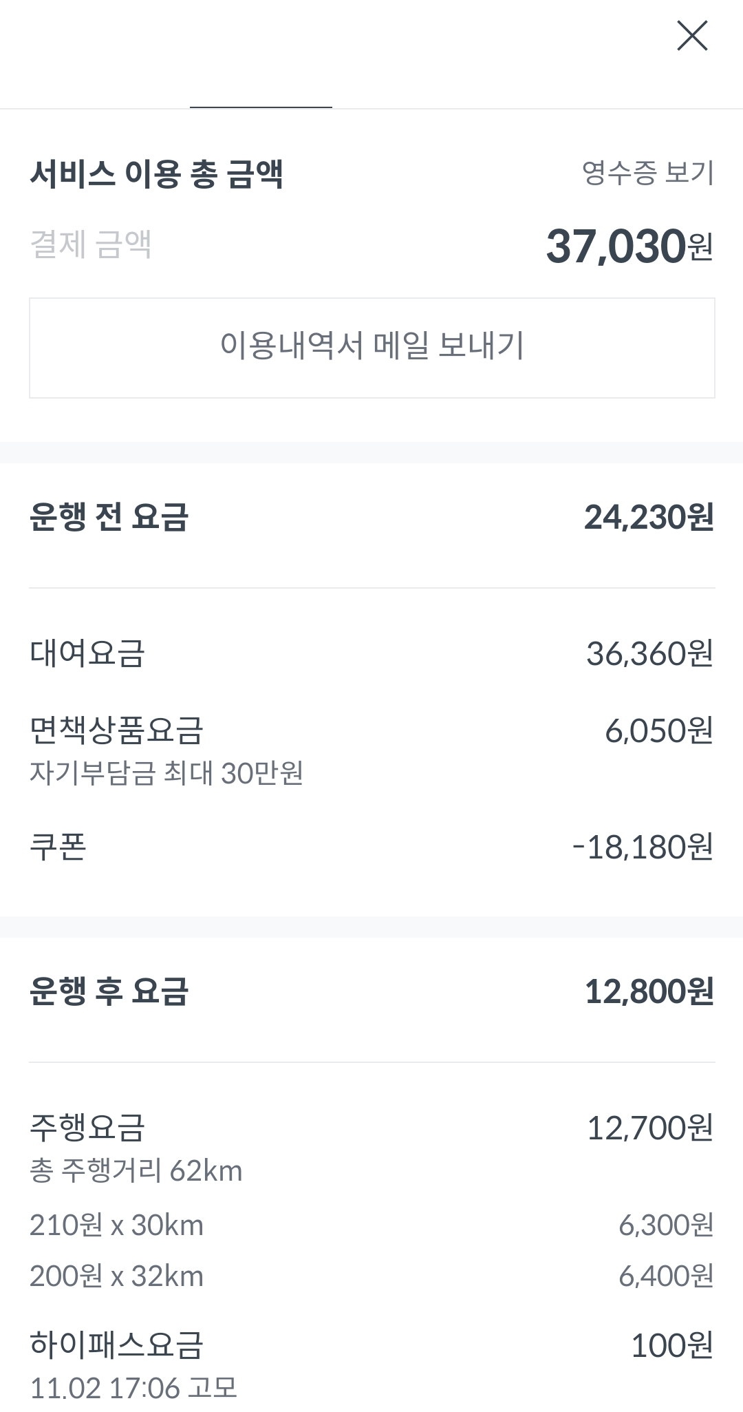 운행 전 후 요금 모두 합해 3만7천원이 나왔습니다