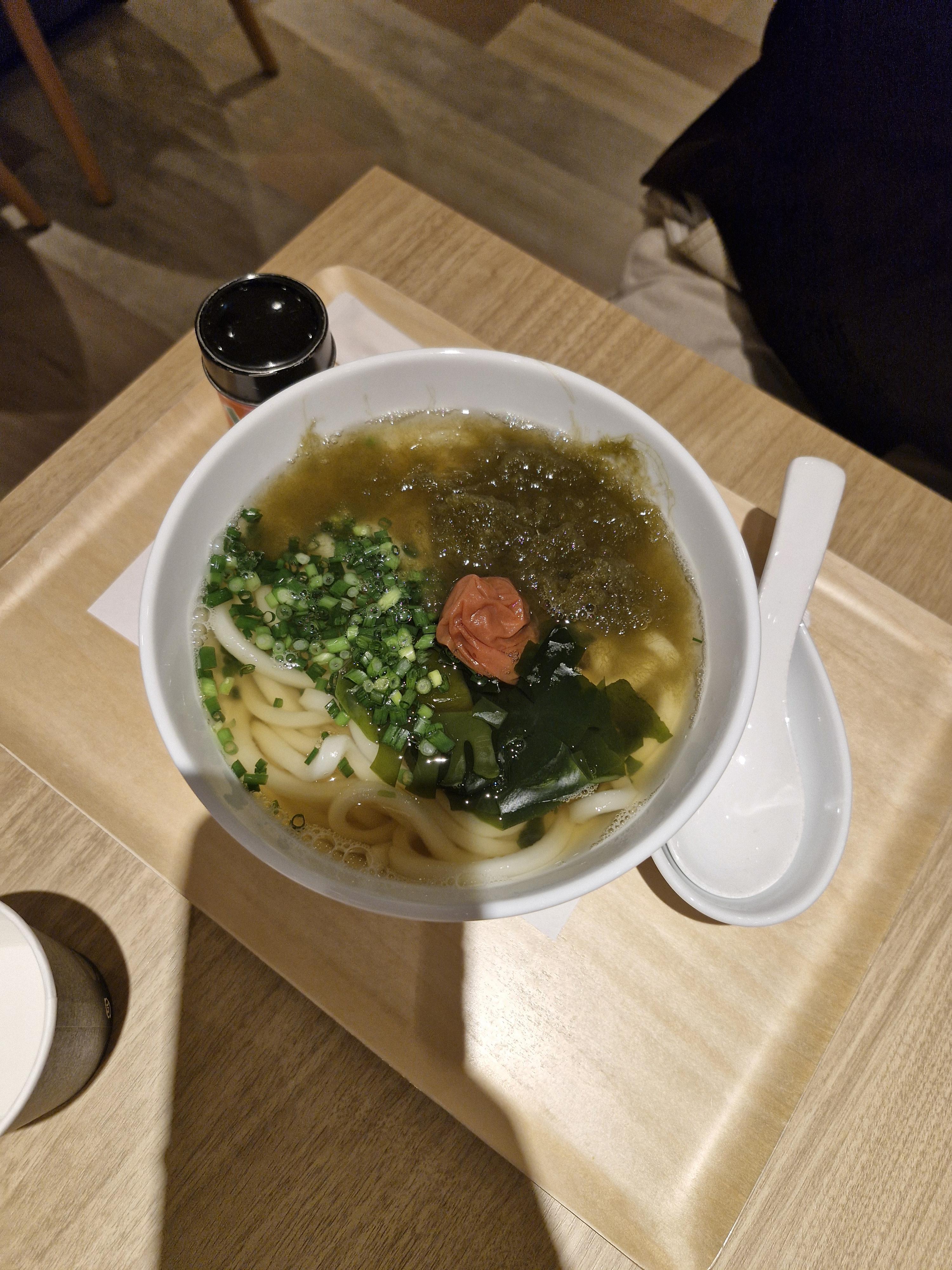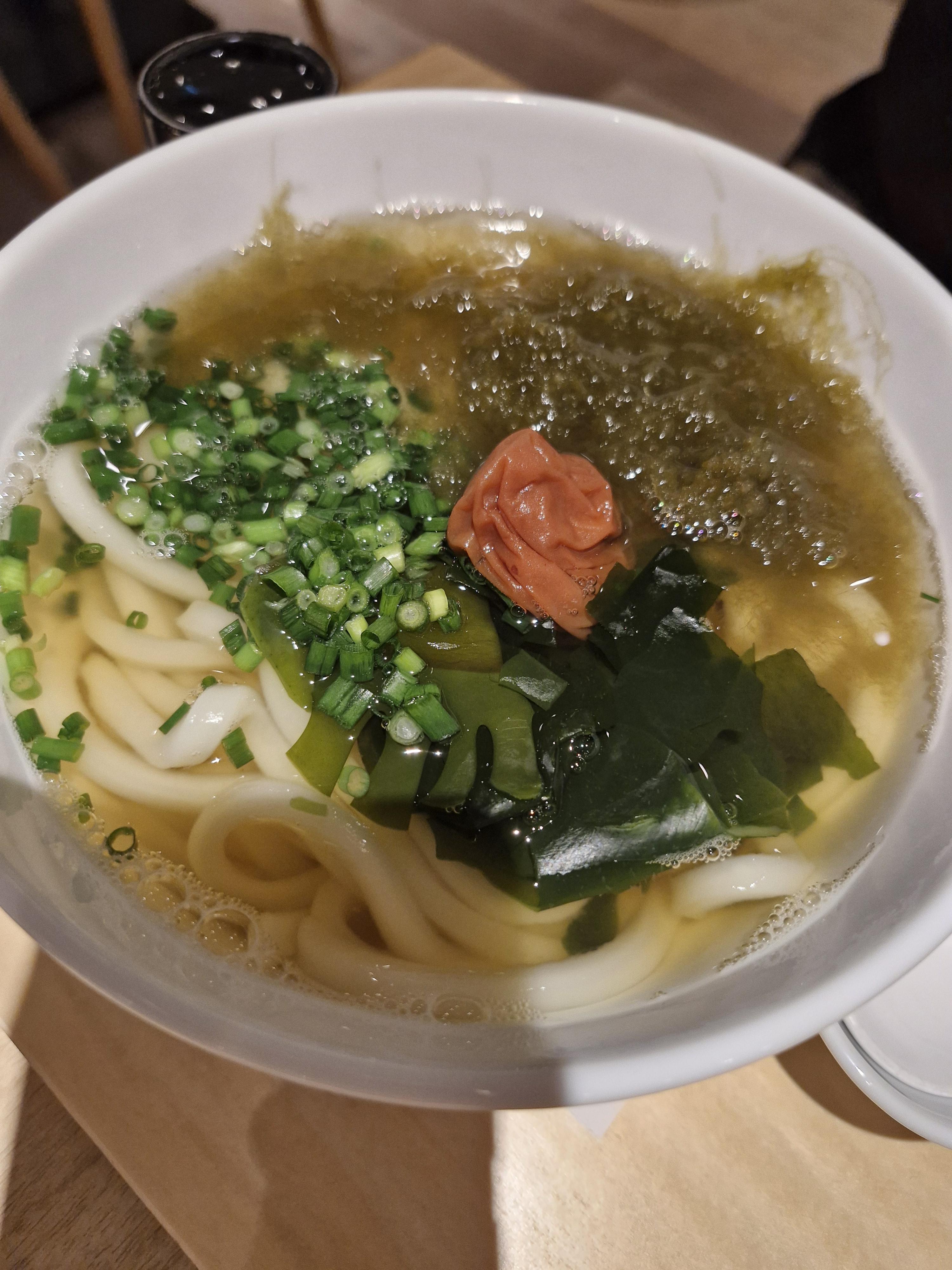 미역 해초가 들어간 우동이고 제일 위의 빨간 동그라미는 일본 매실장아찌인 우메보시입니다
