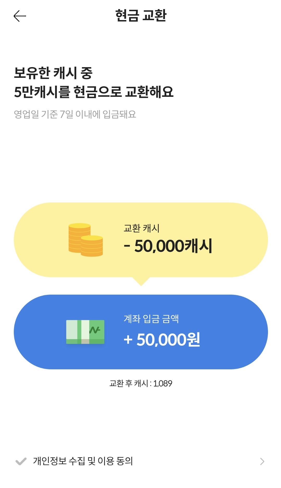 이제 '교환하기' 버튼만 누르면 캐시피드 캐시슬라이드 적립금을 현금으로 받을 수 있습니다