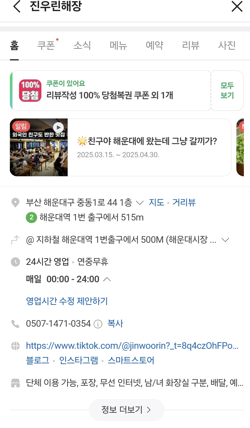 진우린해장 연중무휴 24시간 영업으로 언제든 방문하기 좋습니다