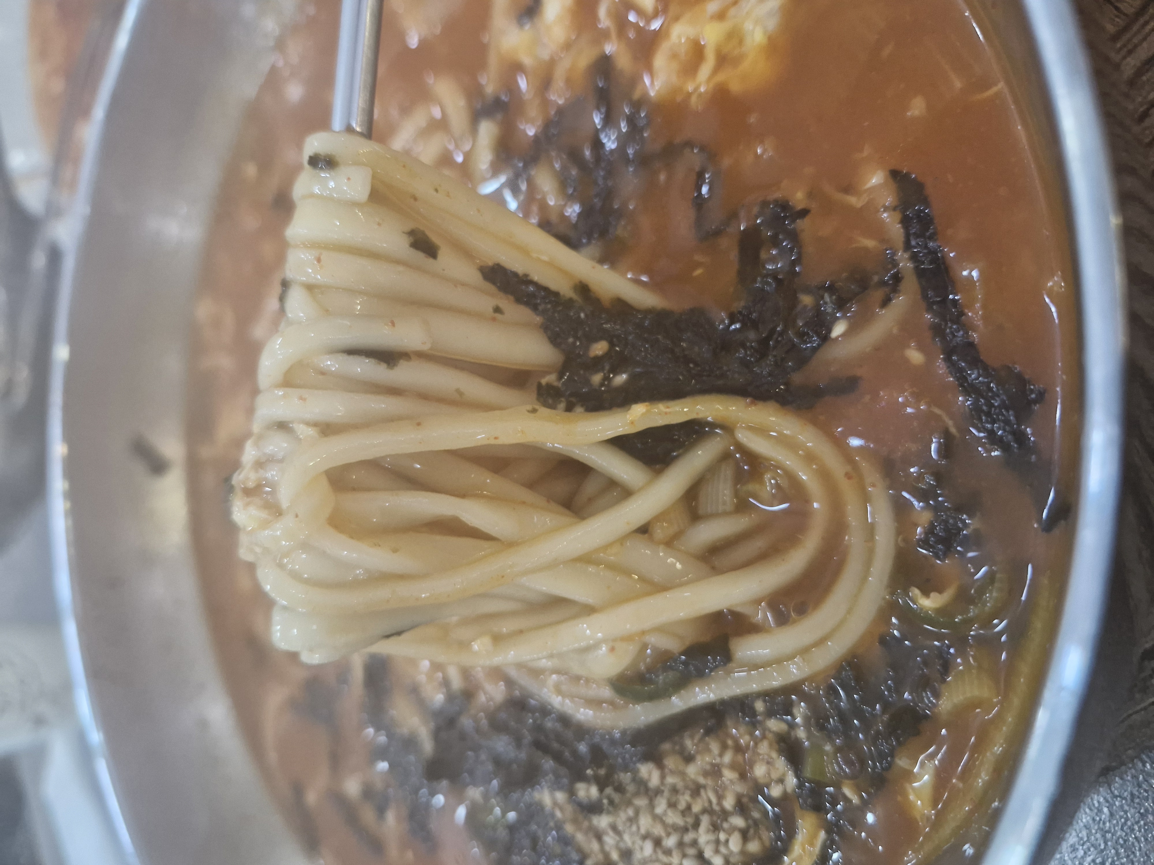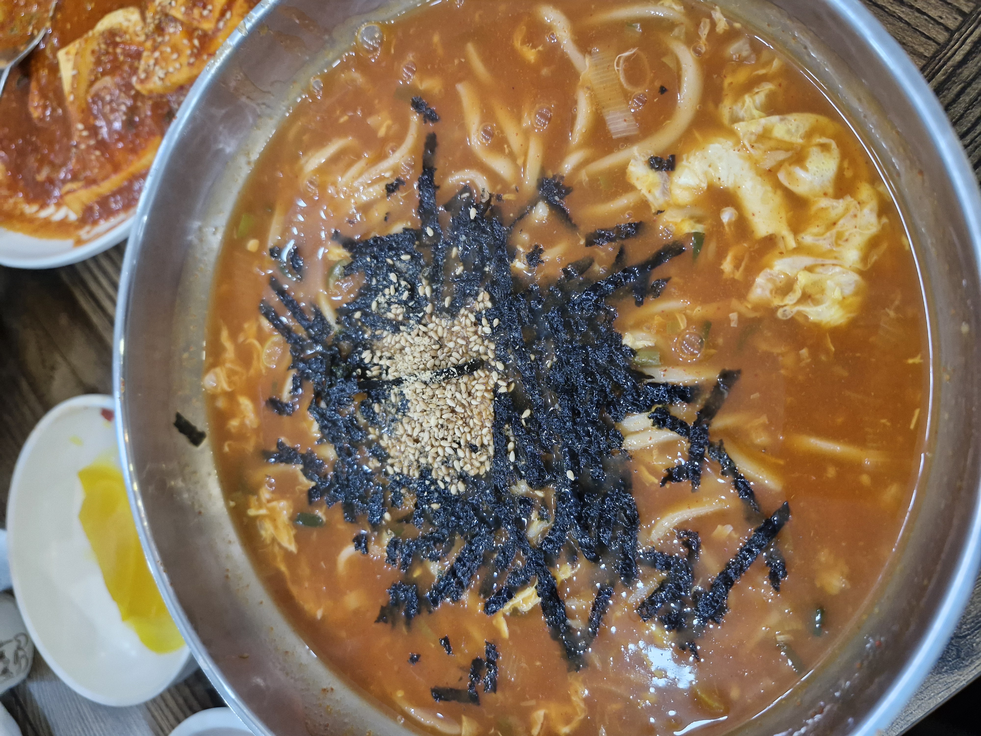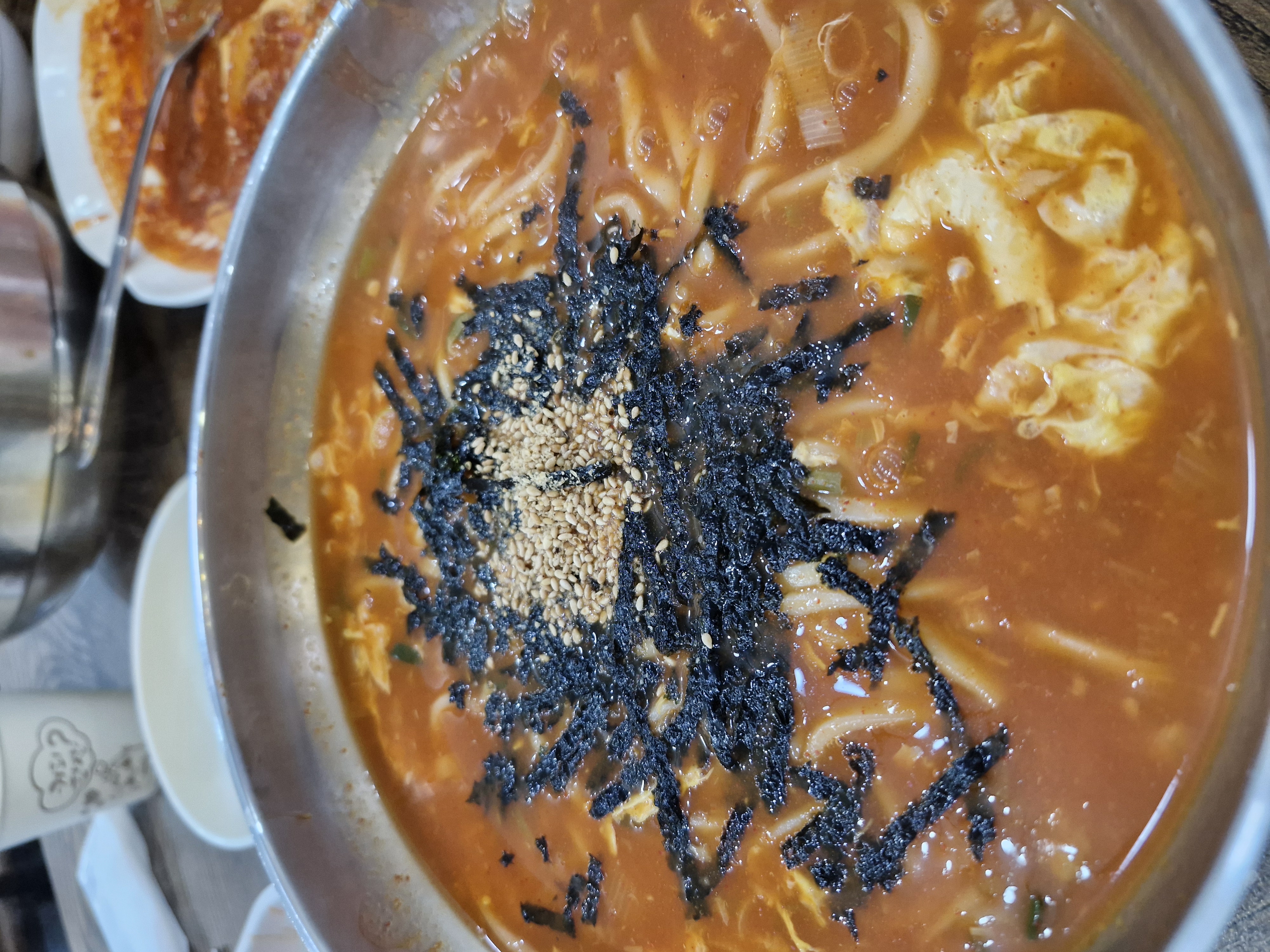 김가루가 넉넉하게 올라가고, 국물엔 달걀이 풀어져 있습니다