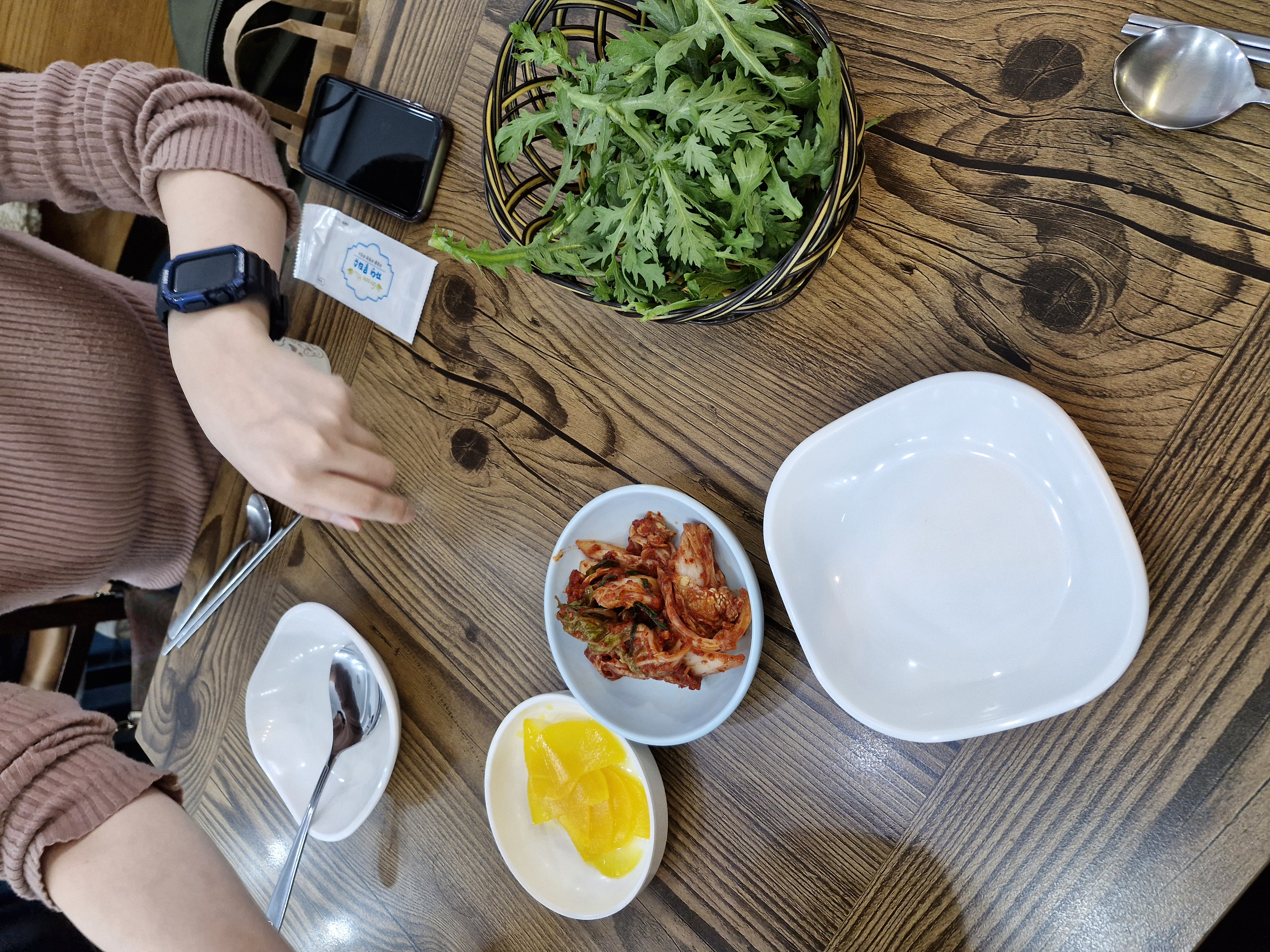 기본적으로 김치, 단무지에 생쑥갓을 주십니다