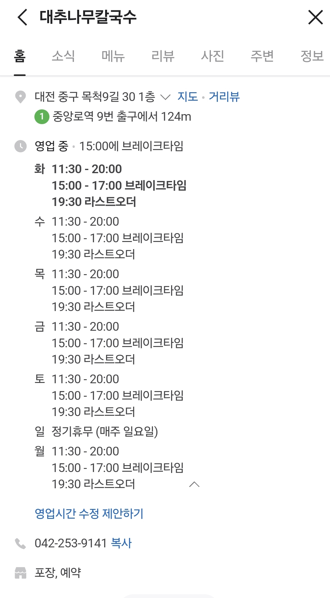 대추나무칼국수 영업시간은 11:30~20:00이나,