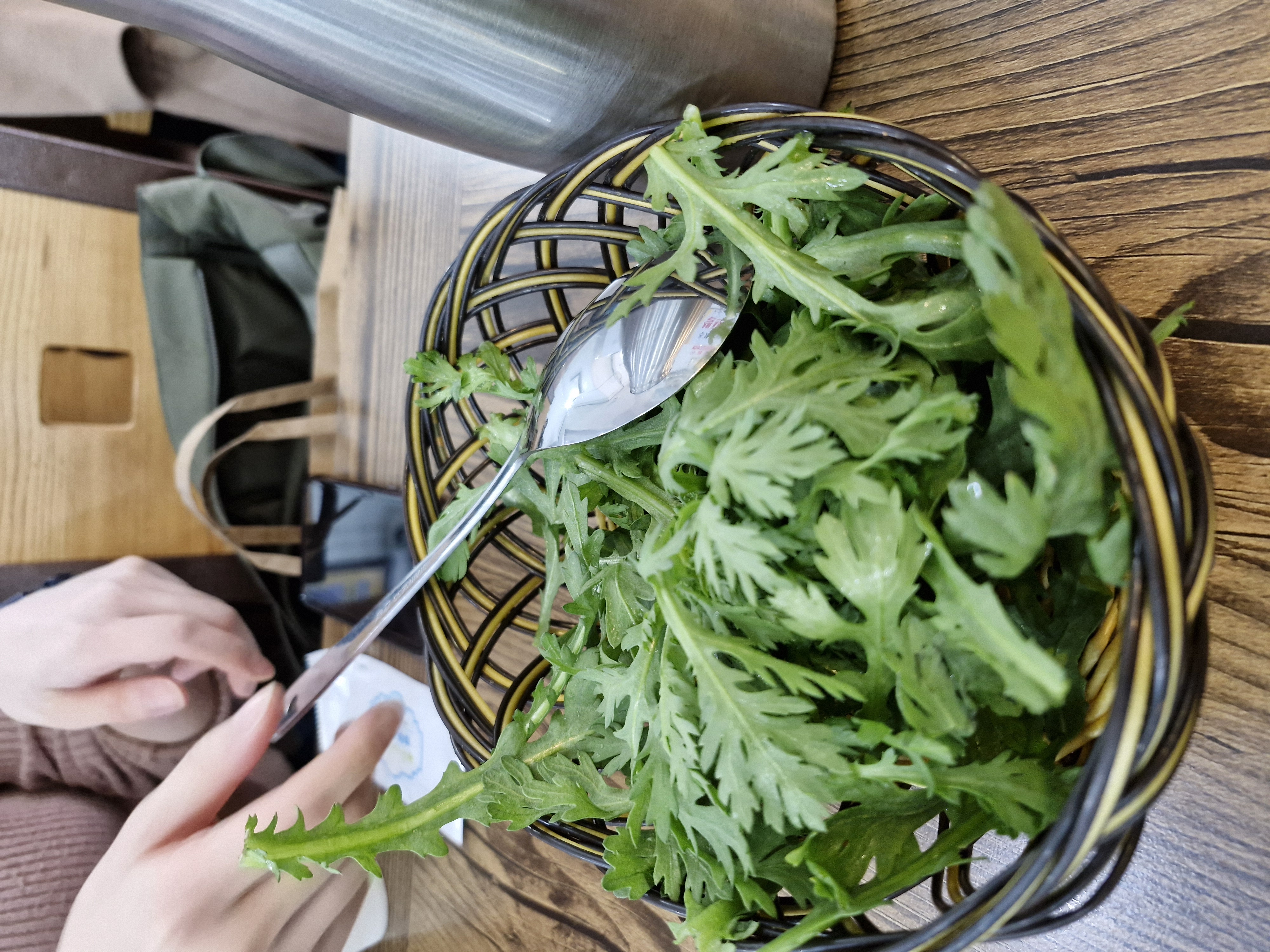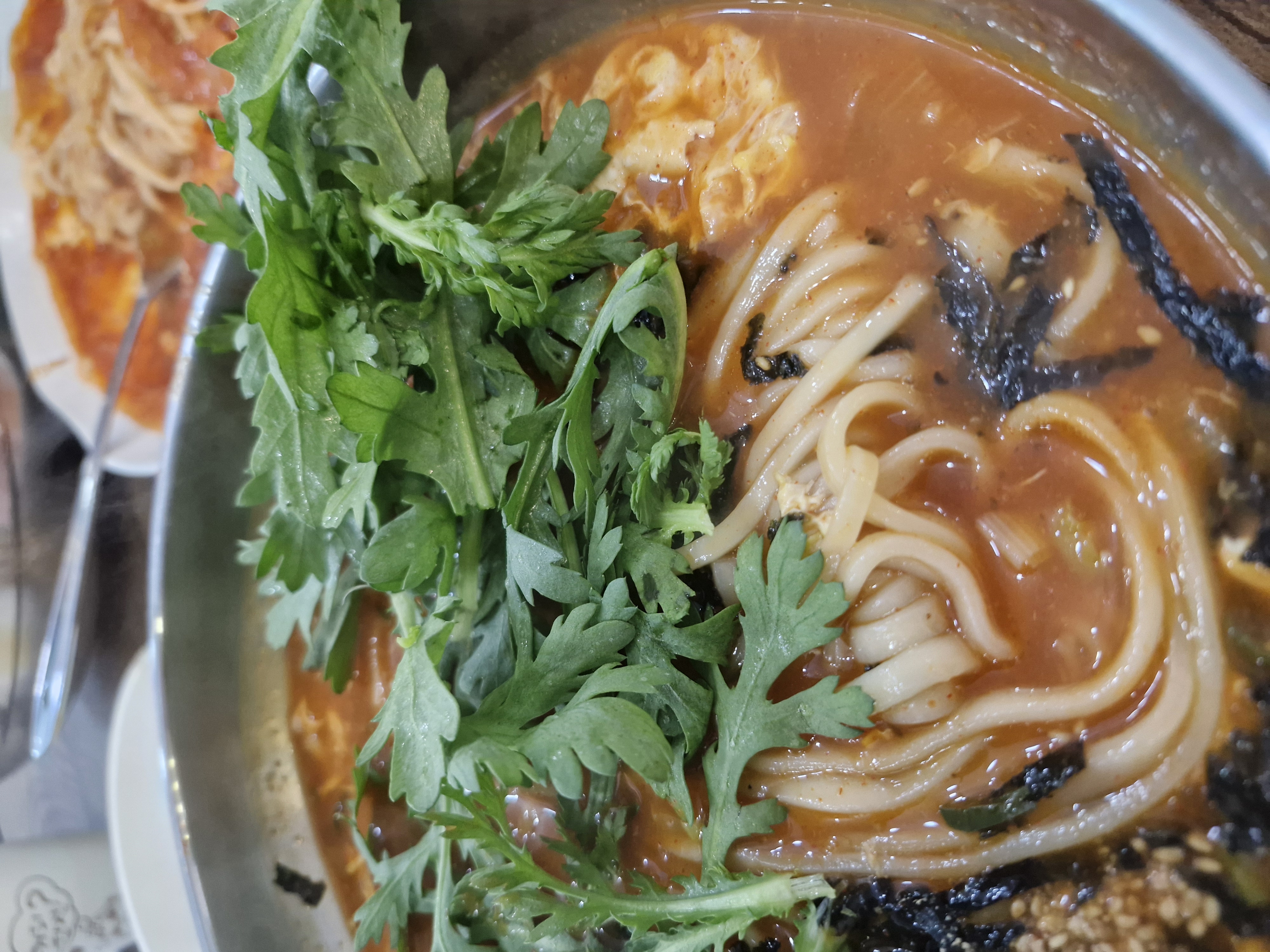 따끈한 국물에 쑥갓이 숨이 죽으면서, 음식의 식감과 향을 모두 살려줍니다