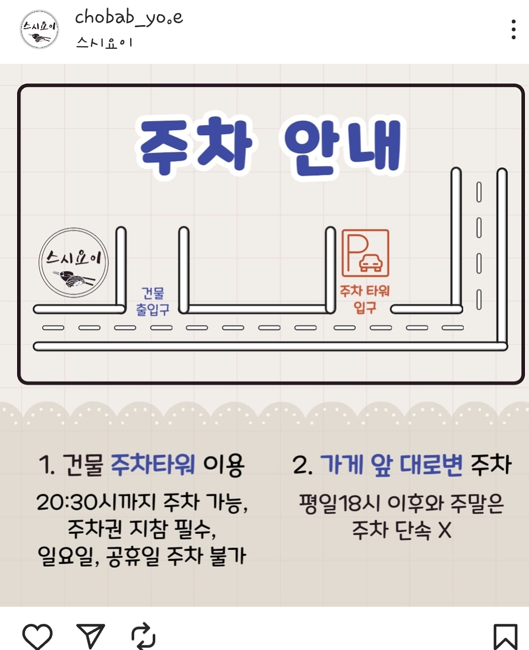 신월성 스시요이는 상가 주차타워를 이용하거나 가게 인근 대로변에 주차할 수 있습니다