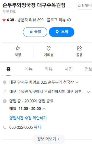 순두부와청국장 대구수목원점 위치 주소 연락처 전화번호 영업시간 운영시간