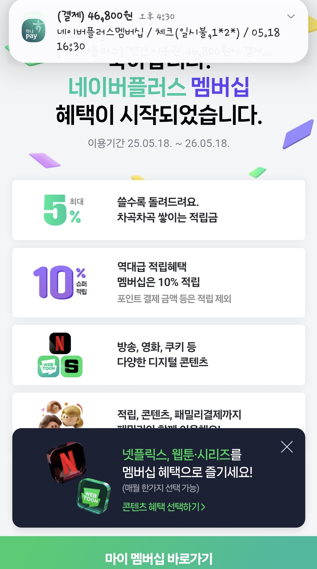 저는 네이버플러스 연간이용권 가입 후 넷플릭스 계정연결까지 완료했습니다