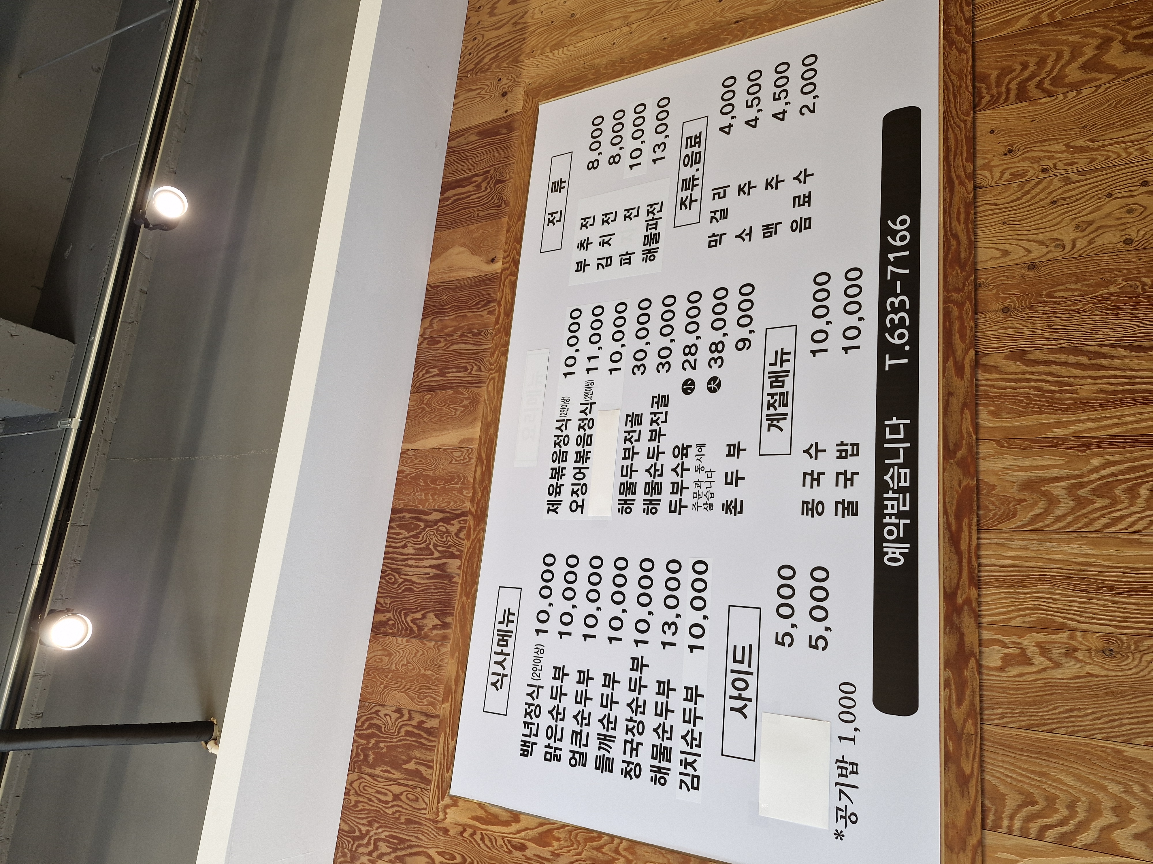 메인 메뉴는 순두부 종류고요, 한식 정식/두부수육/김치전 파전 등 안주류도 다양합니다