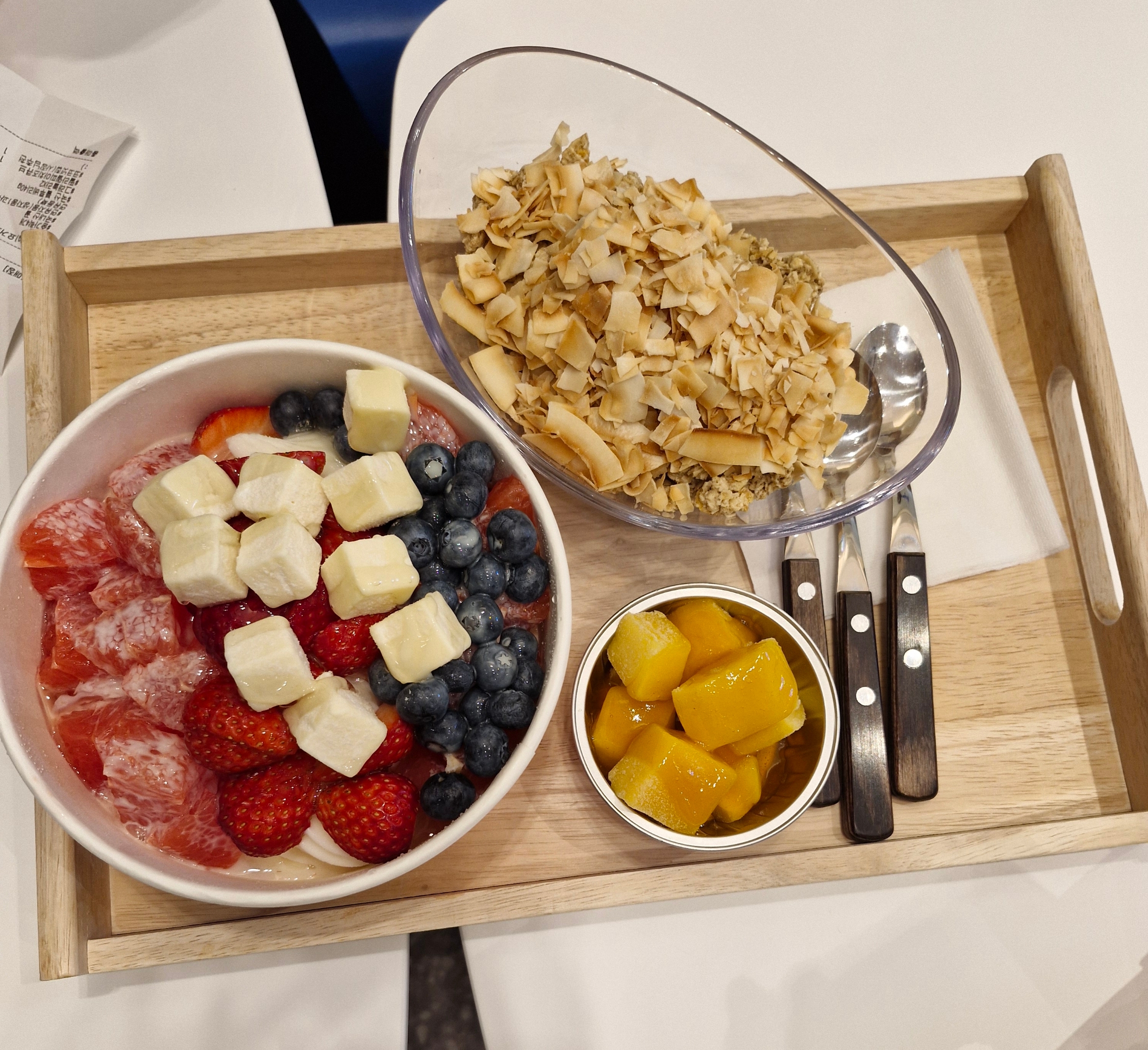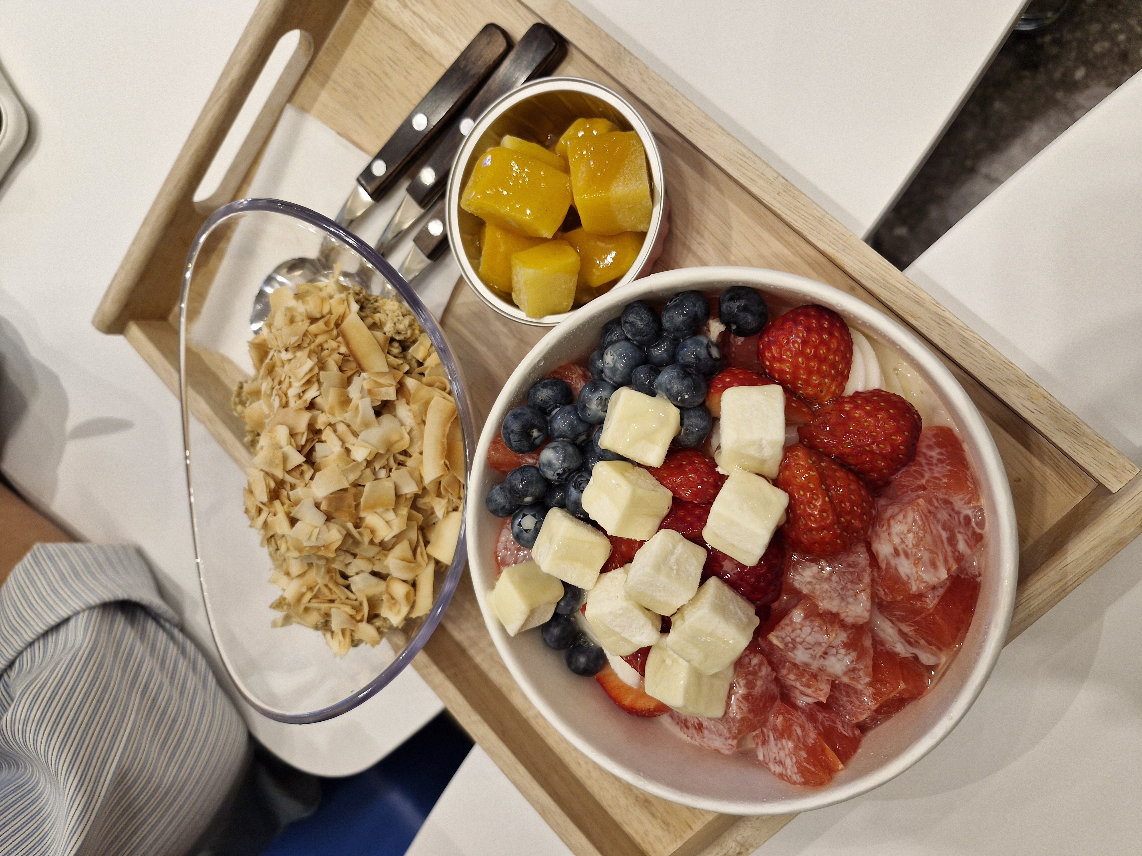 일단 요거트 위에 올라간 과일과 치즈를 반 이상 먹은 후에 코코넛칩을 부어야 했는데, 여기까지도 먹는데 한참 걸렸어요