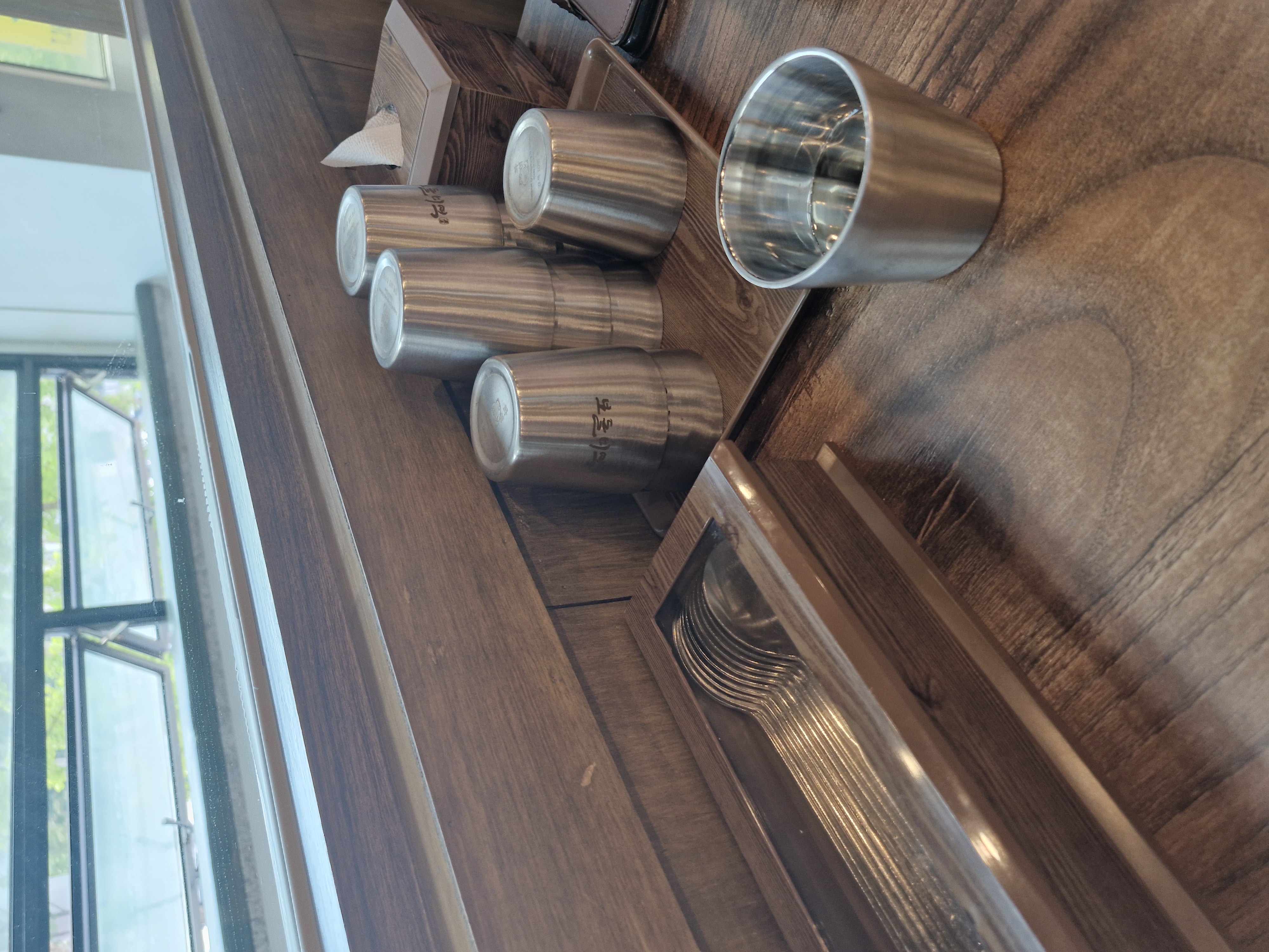테이블 위에 숟가락과 물컵이 있는데 모두 깔끔하더라고요