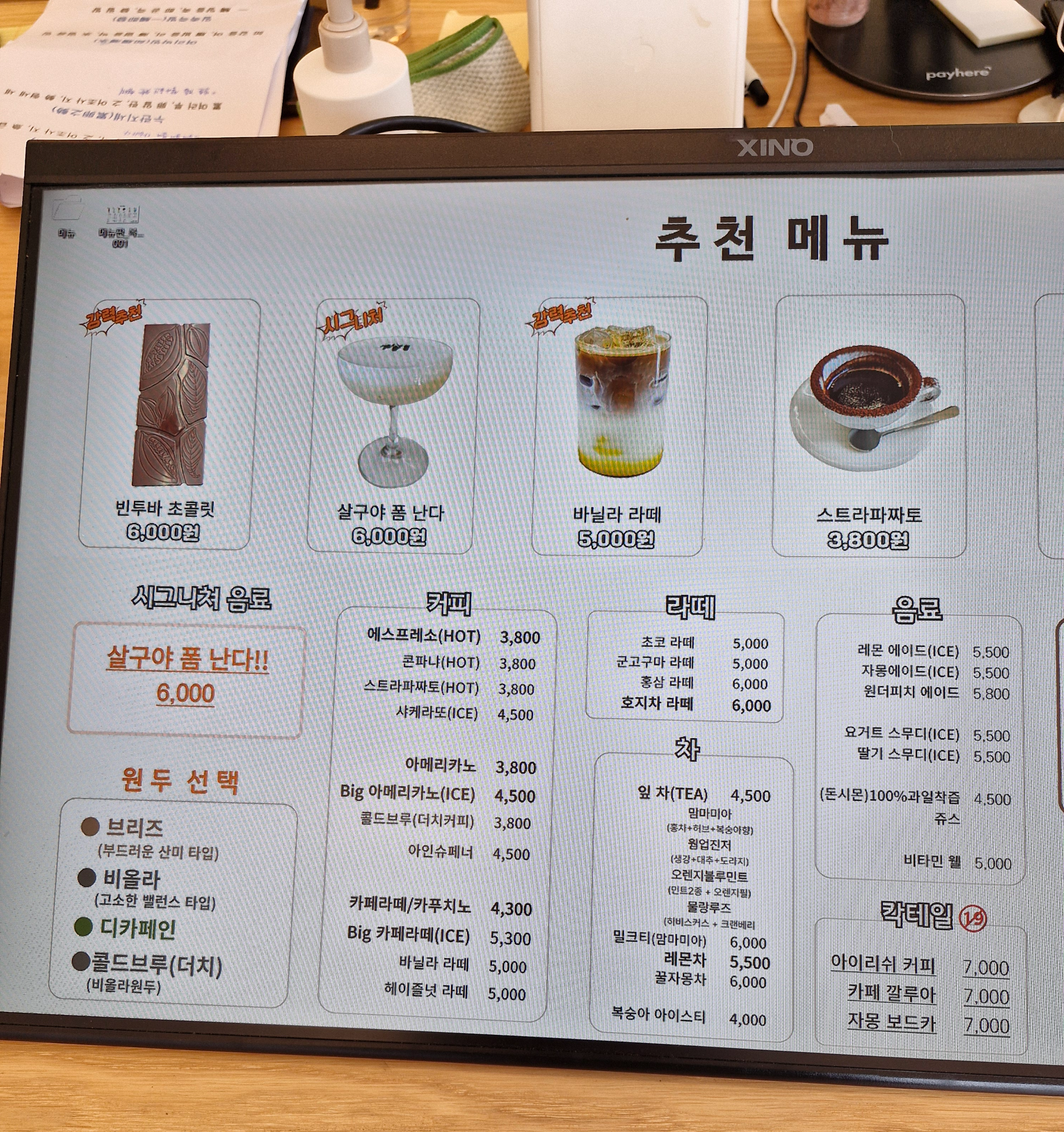 커피 원두 선택 가능하고 디카페인, 칵테일 등 선택권이 다양합니다