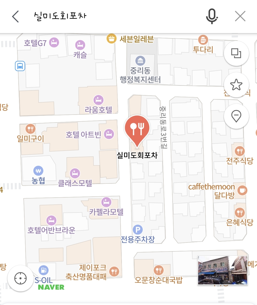 실미도회포차는 지도에서 보시다시피 중리동 행정복지센터 및 수많은 모텔촌 가운데에 있습니다
