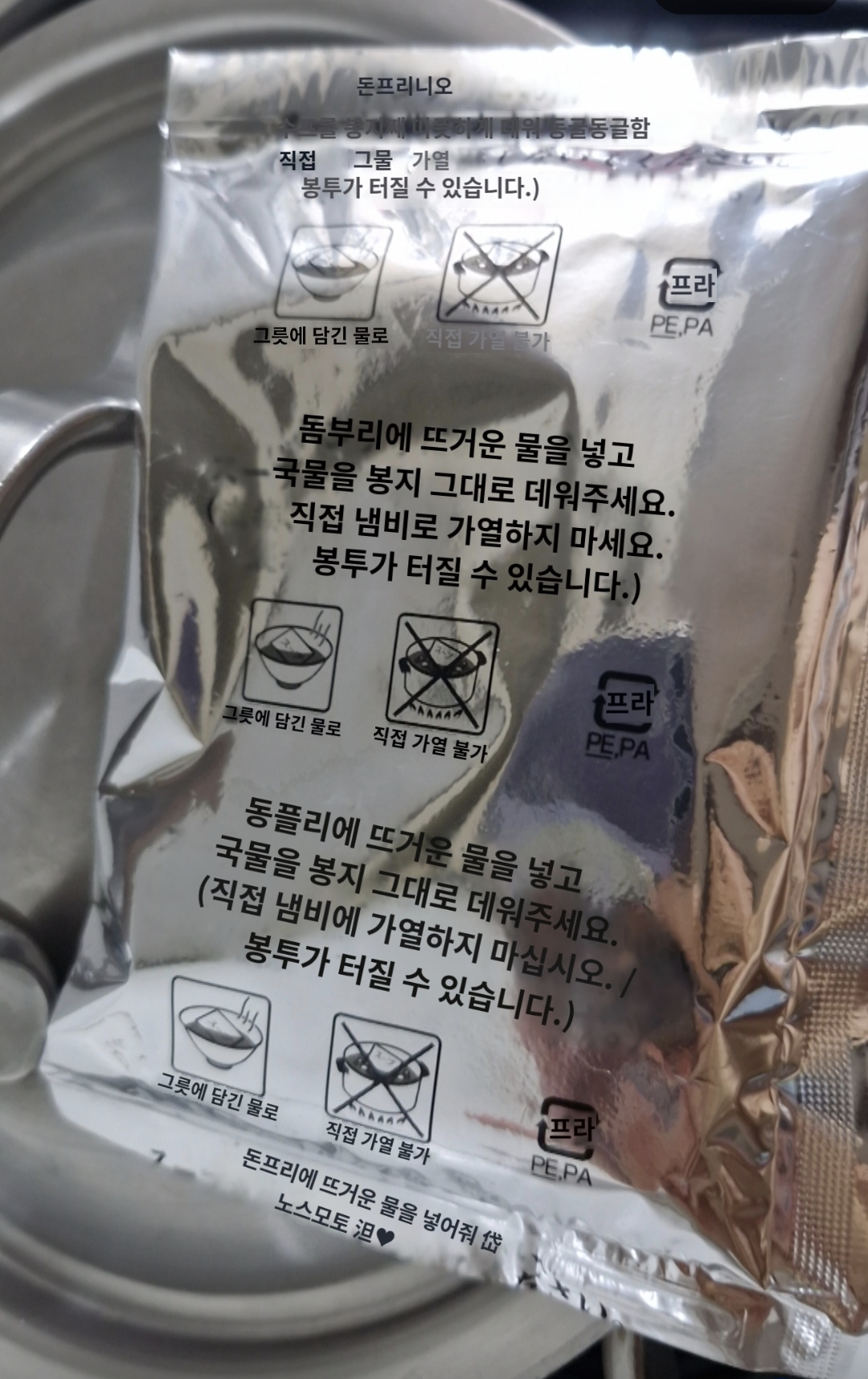 스프를 바로 물에 넣는 경우도 있지만, 이 제품은 미리 가열한 후 먹으라고 하네요