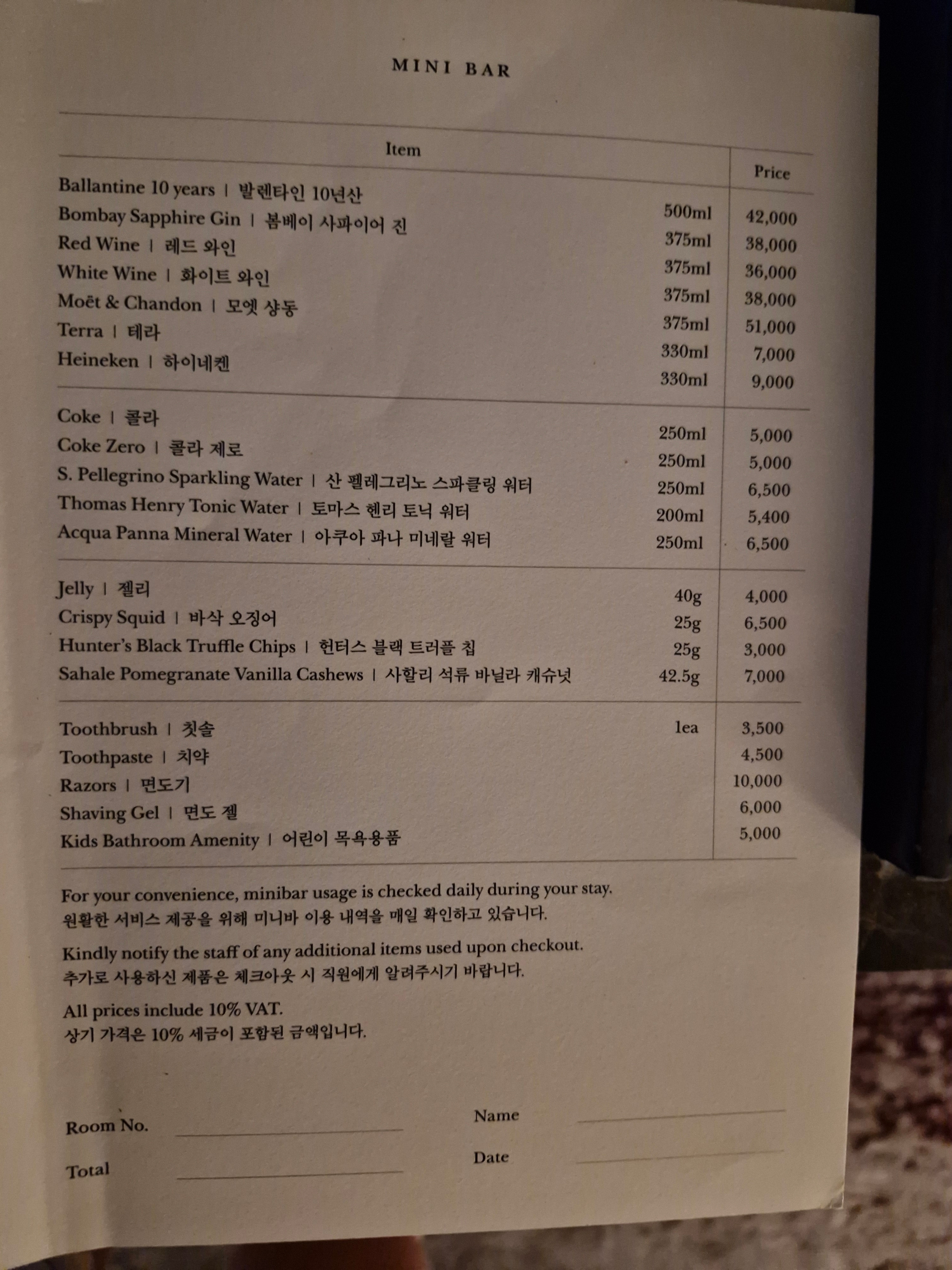 어매니티 제공, 미니바 이용, 시설이용 등에 관한 안내가 적혀있습니다