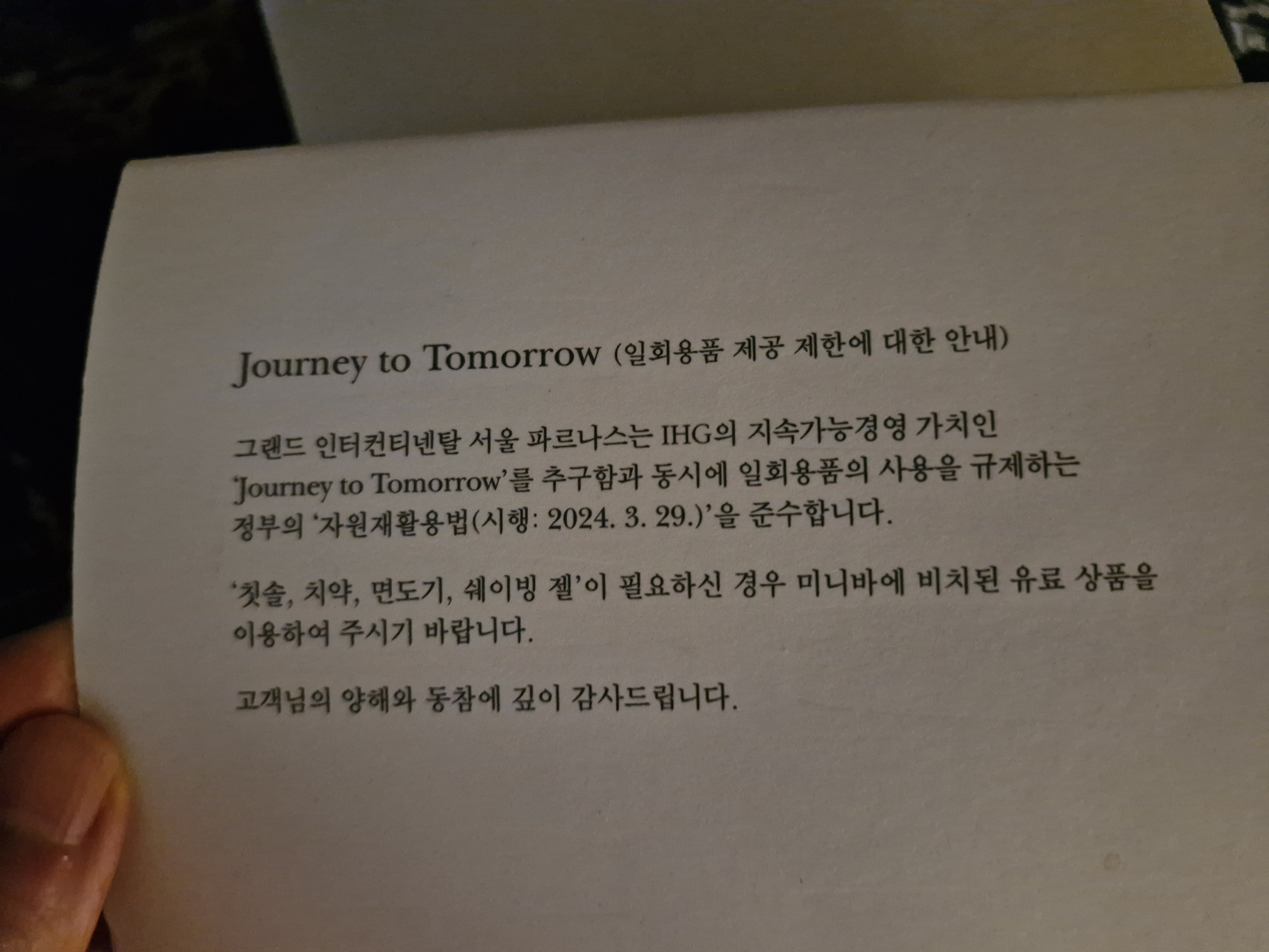 환경정책 때문에 치약칫솔 등 일회용품 제공되지 않는다고 합니다