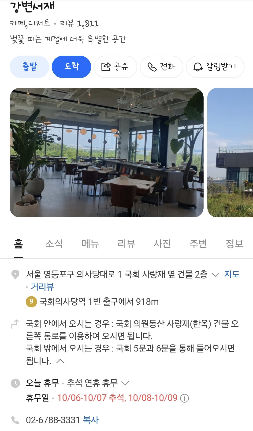 국회의사당도 구경하고, 한강 운치를 즐기며 커피 한 잔도 마실 수 있는 카페 '강변서재'를 추천해 드립니다