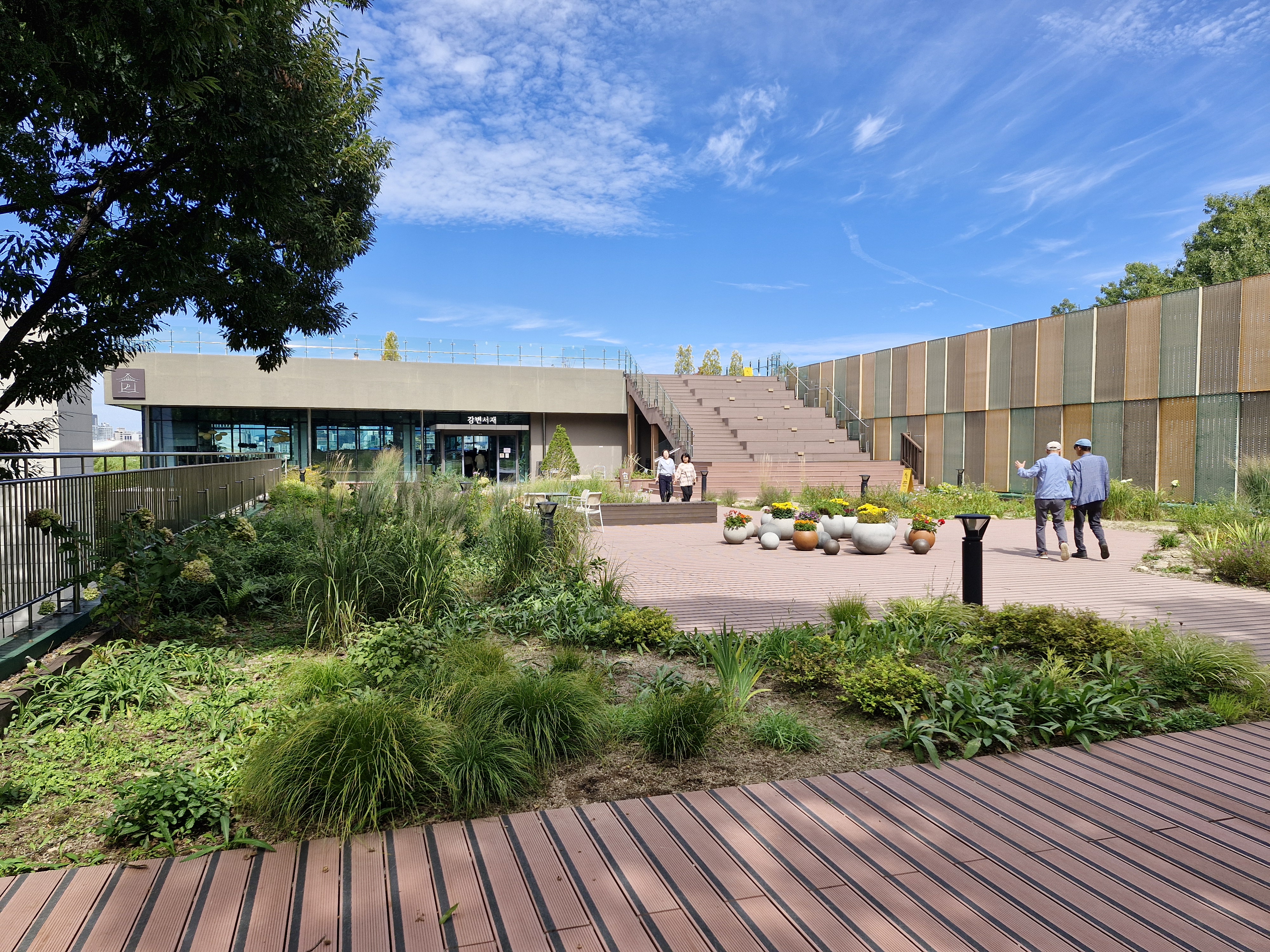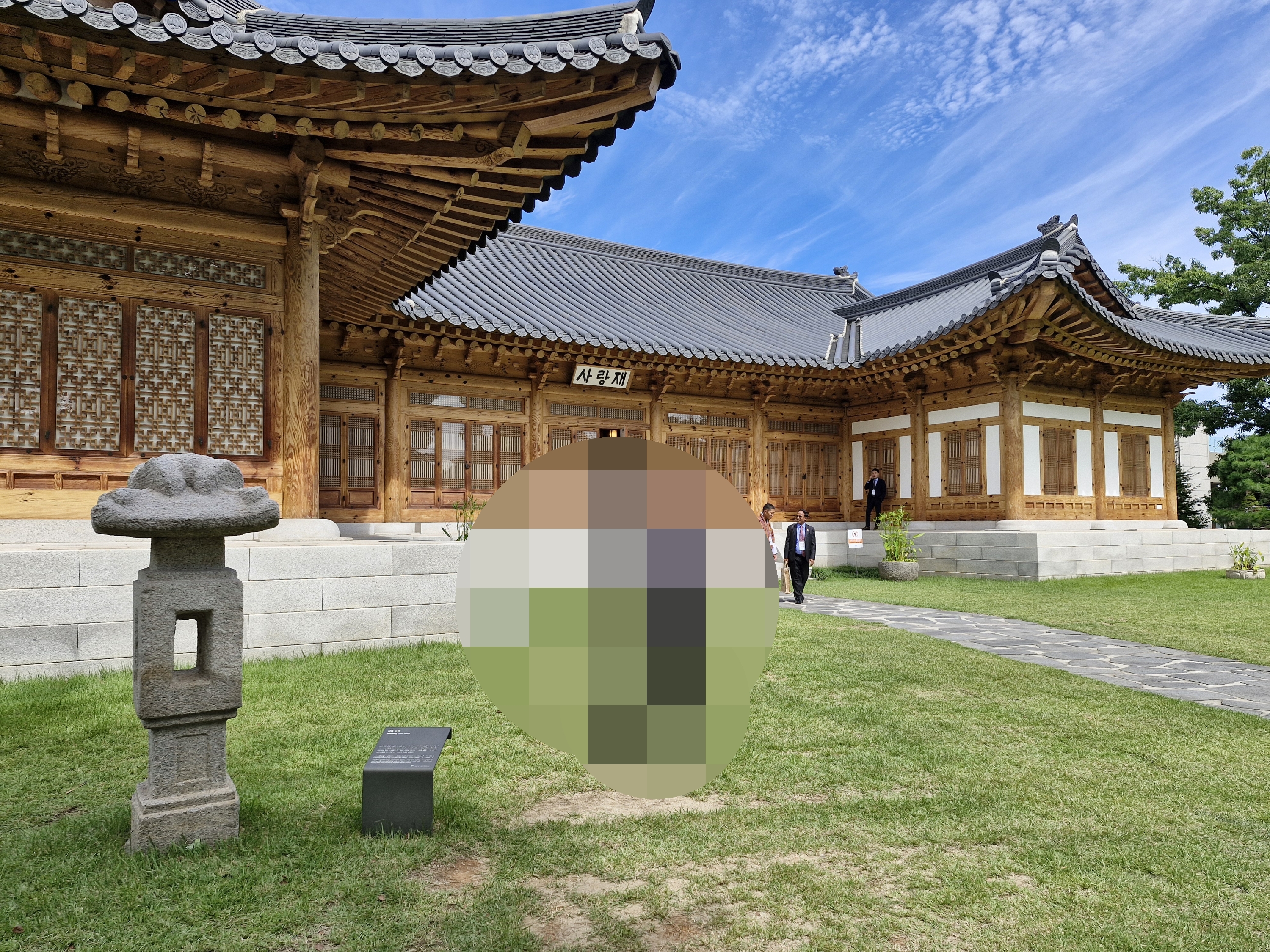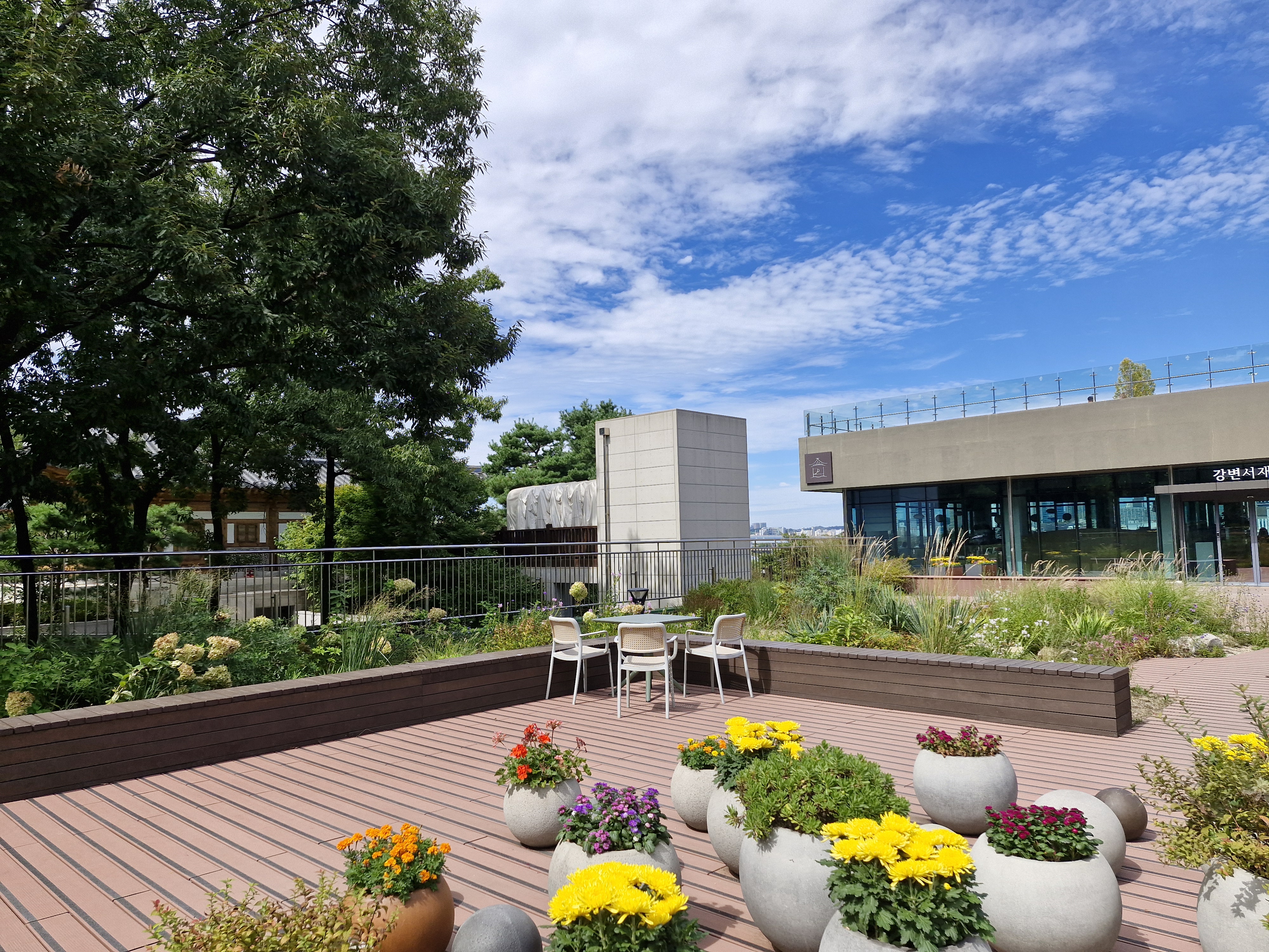 반대쪽 자리에서는 예쁜 사랑채 한옥건물도 보이고, 파릇파릇 잘 식재한 정원과 꽃들도 눈에 띕니다