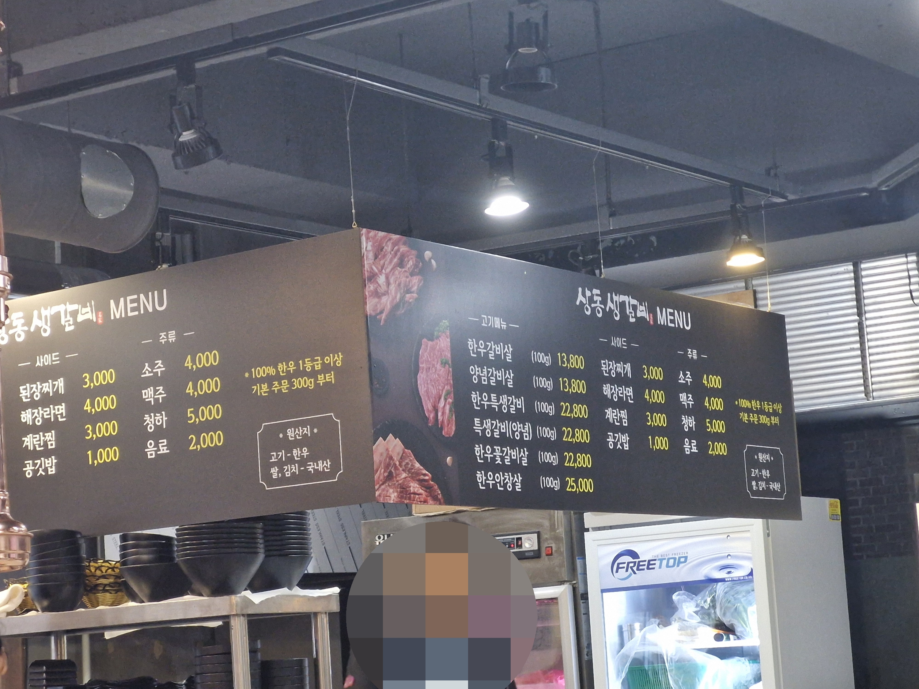 전 메뉴가 모두 한우인데, 기본 한우갈비살 가격이 100g 13800원으로 아주 착합니다