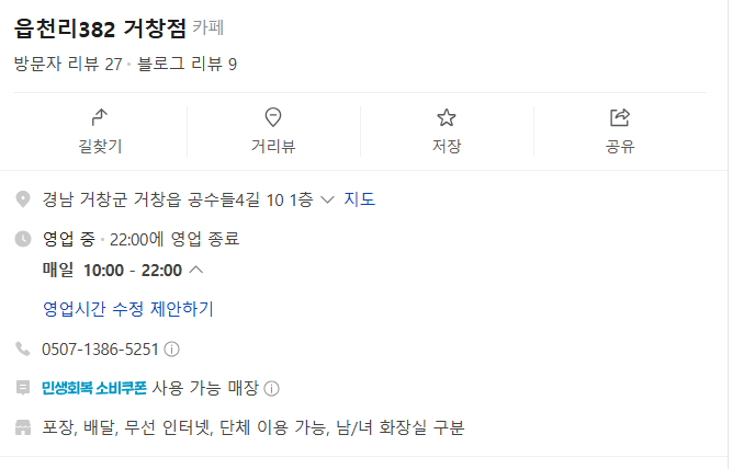 거창읍 카페추천 '읍천리 382 거창점' 위치, 주차