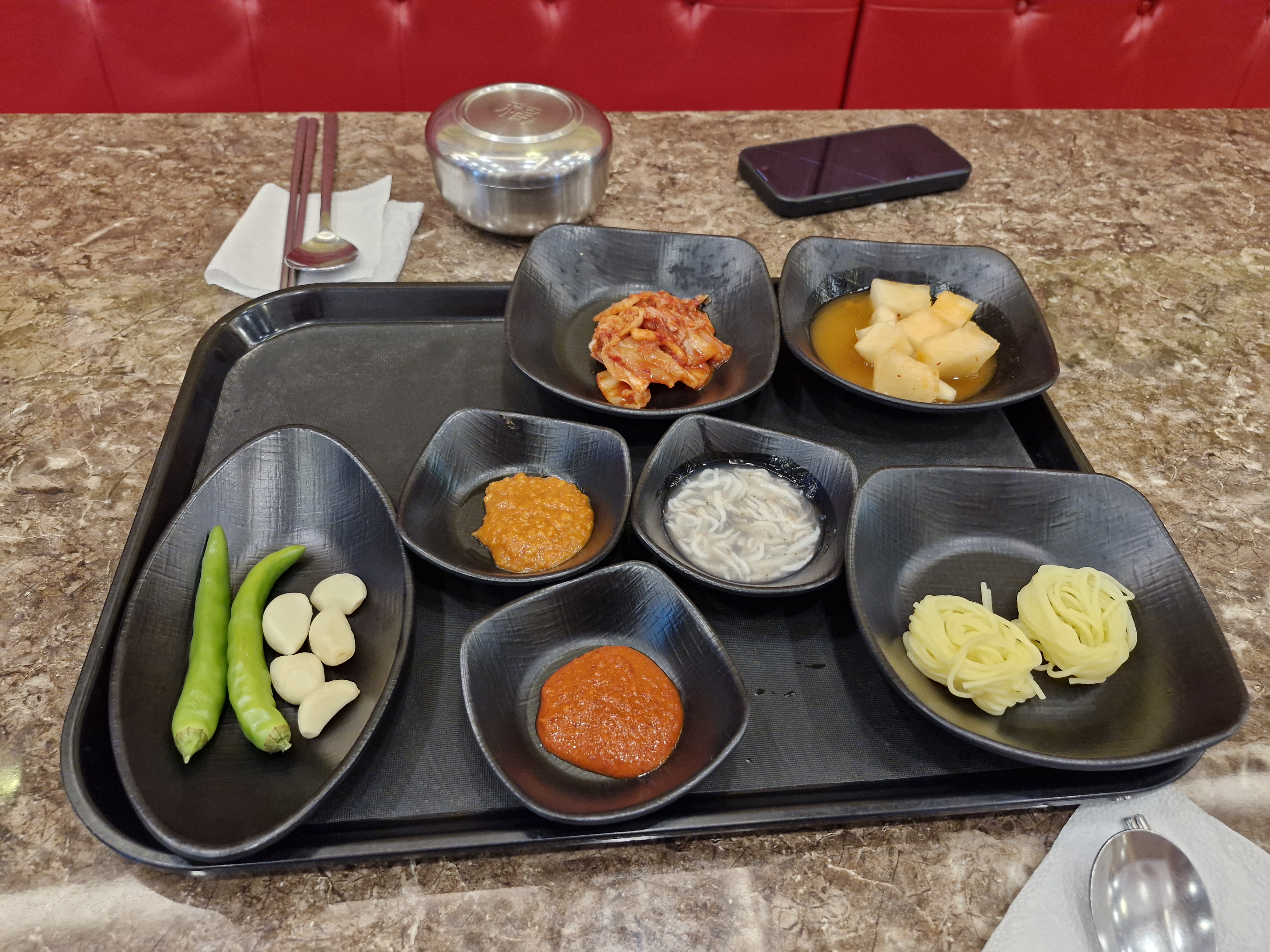 가게 안에 셀프바가 있어서 김치, 마늘, 새우젓 등을 자유롭게 더 가져다 드실 수 있습니다