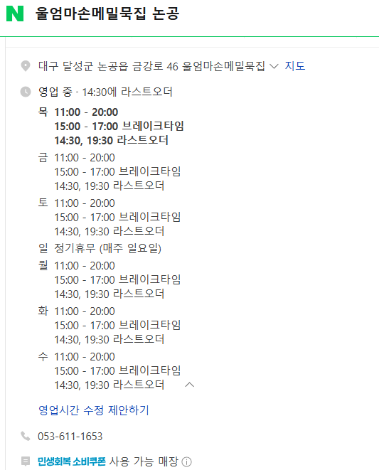 달성군청 '울엄마손메밀묵집' 위치, 영업시간논공 울엄마손메밀묵집 위치 주소 연락처 전화번호 영업시간 운영시간