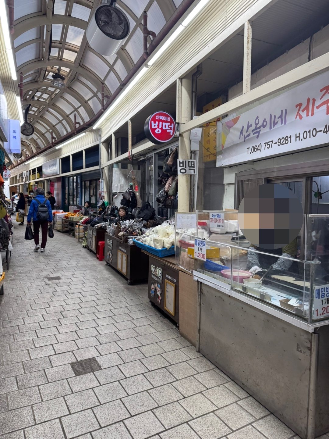 이곳 제주 동문시장 내 '산옥이네' 점포에서 구매한 제주 전통 음식 빙떡을 리뷰합니다
